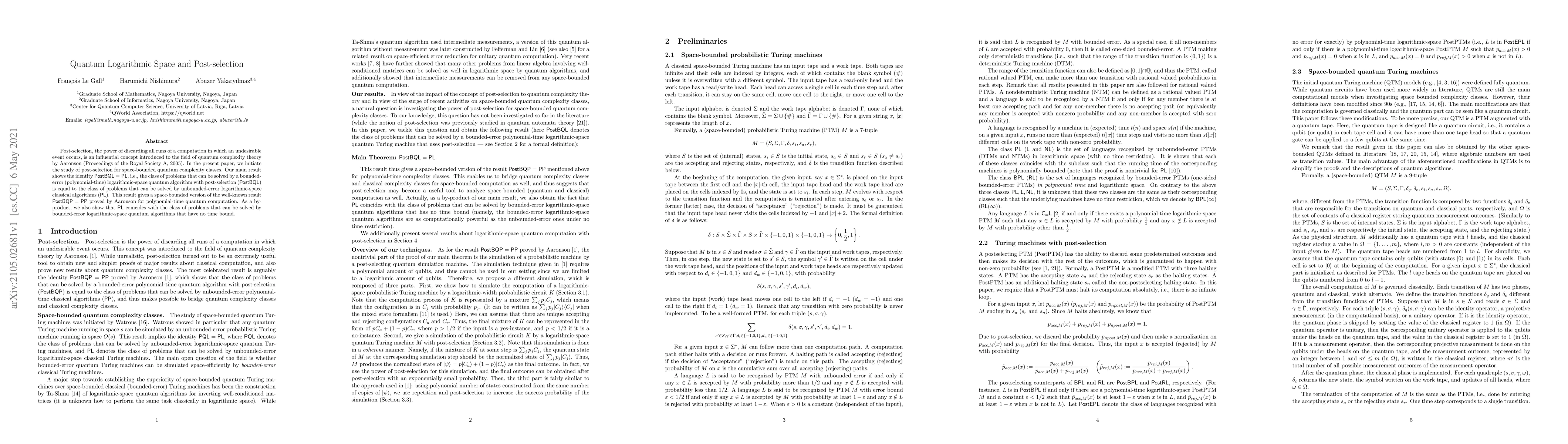 This paper explores post-selection in quantum complexity theory, demonstrating that post-selection for space-bounded quantum algorithms ($\sf PostBQL$) equals classical logarithmic-space algorithms ($\sf PL$), mirroring a known result for polynomial-time quantum computation. Additionally, it shows that $\sf PL$ is equivalent to bounded-error logarithmic-space quantum algorithms without time constraints.
