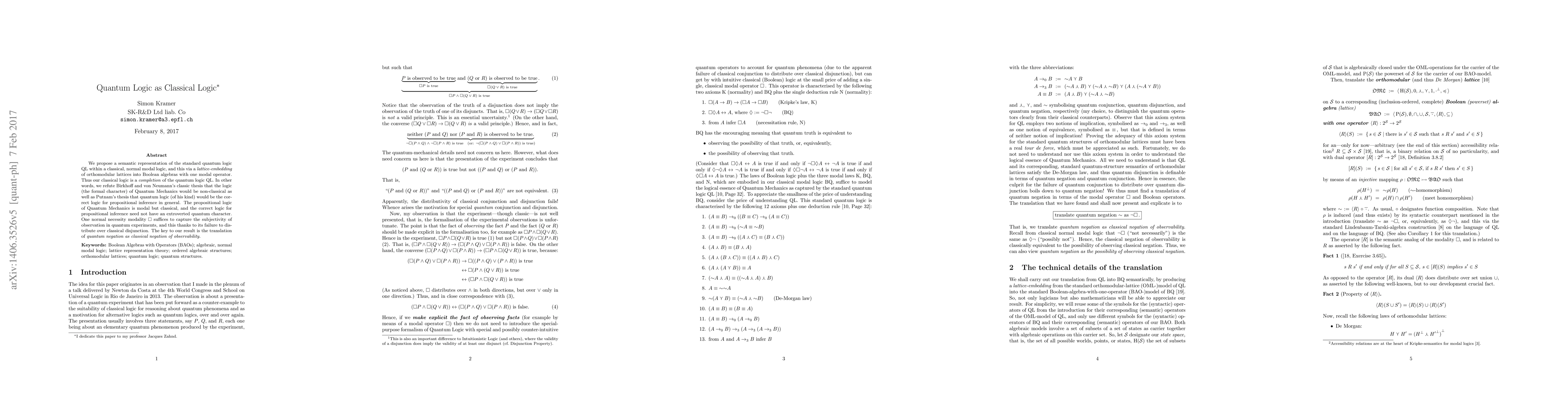 The paper presents a lattice-embedding of orthomodular lattices into Boolean algebras with a single modal operator, demonstrating that quantum logic can be represented classically.