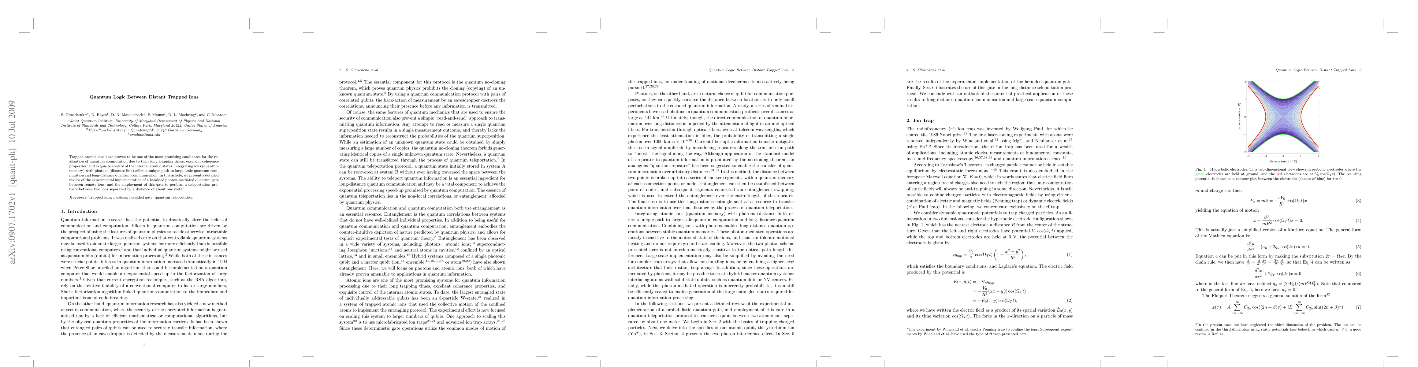This paper reviews the experimental setup for a photon-mediated quantum gate between distant trapped ions, demonstrating its use in a teleportation protocol over a one-meter separation, highlighting the potential for large-scale quantum computation and communication.
