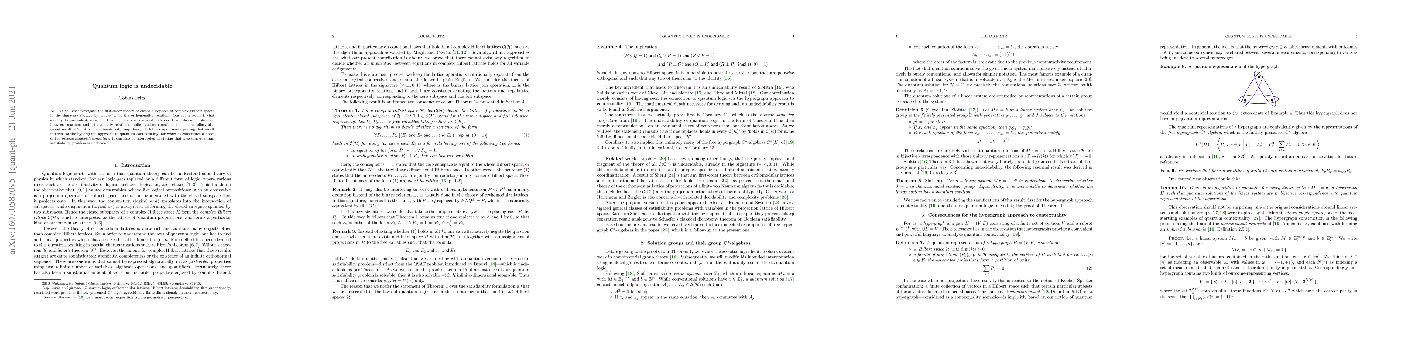 We investigate the first-order theory of closed subspaces of complex Hilbert spaces in the signature $(\lor,\perp,0,1)$, where `$\perp$' is the orthogonality relation. Our main result is that already its quasi-identities are undecidable: there is no algorithm to decide whether an implication between equations and orthogonality relations implies another equation. This is a corollary of a recent result of Slofstra in combinatorial group theory. It follows upon reinterpreting that result in terms of the hypergraph approach to quantum contextuality, for which it constitutes a proof of the inverse sandwich conjecture. It can also be interpreted as stating that a certain quantum satisfiability problem is undecidable.