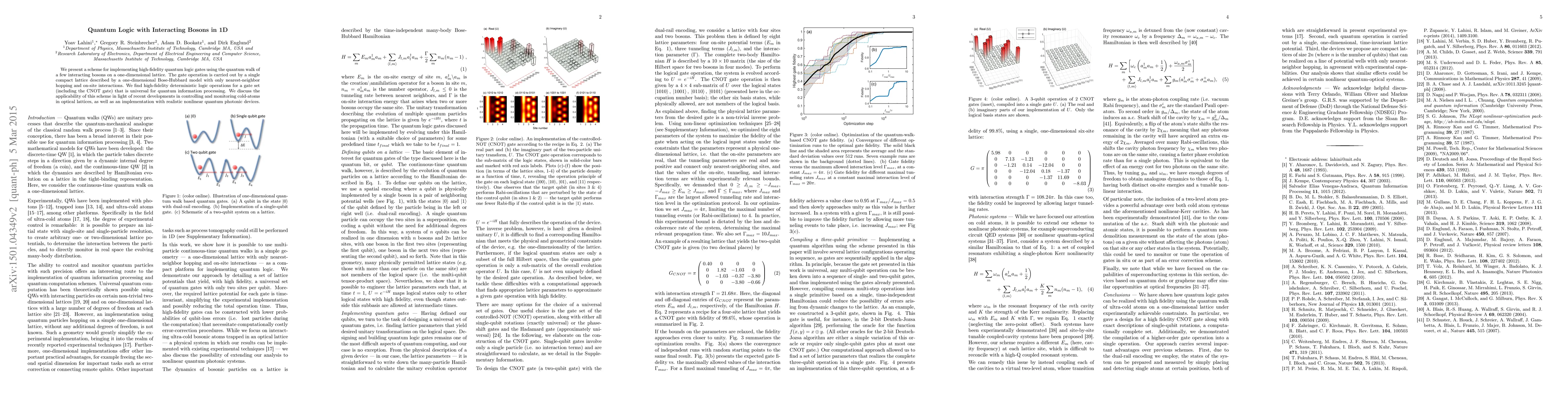 This research proposes a method for creating high-fidelity quantum logic gates using the quantum walk of a few interacting bosons on a one-dimensional lattice. The scheme, based on a one-dimensional Bose-Hubbard model, enables universal quantum information processing, including CNOT gates, and is applicable to cold-atom control in optical lattices and quantum photonic devices.