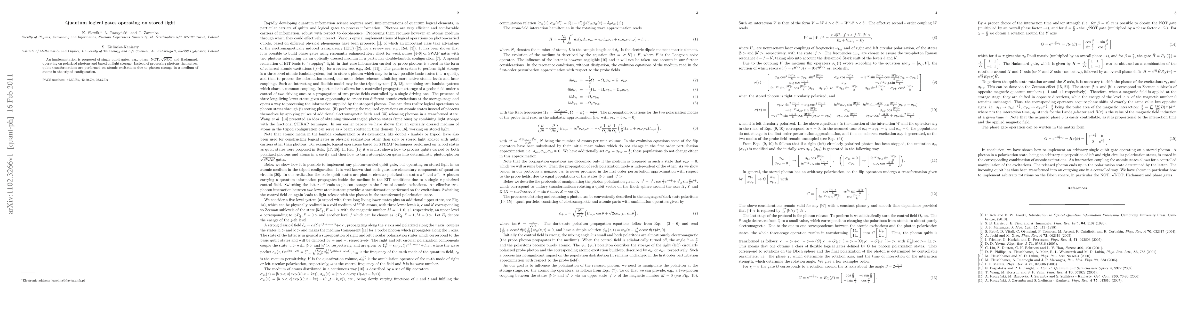 Summary: The paper proposes a method for implementing single qubit quantum logical gates on polarized photons using light storage in a tripod atomic configuration, transforming qubit operations via atomic excitations rather than direct photon processing.