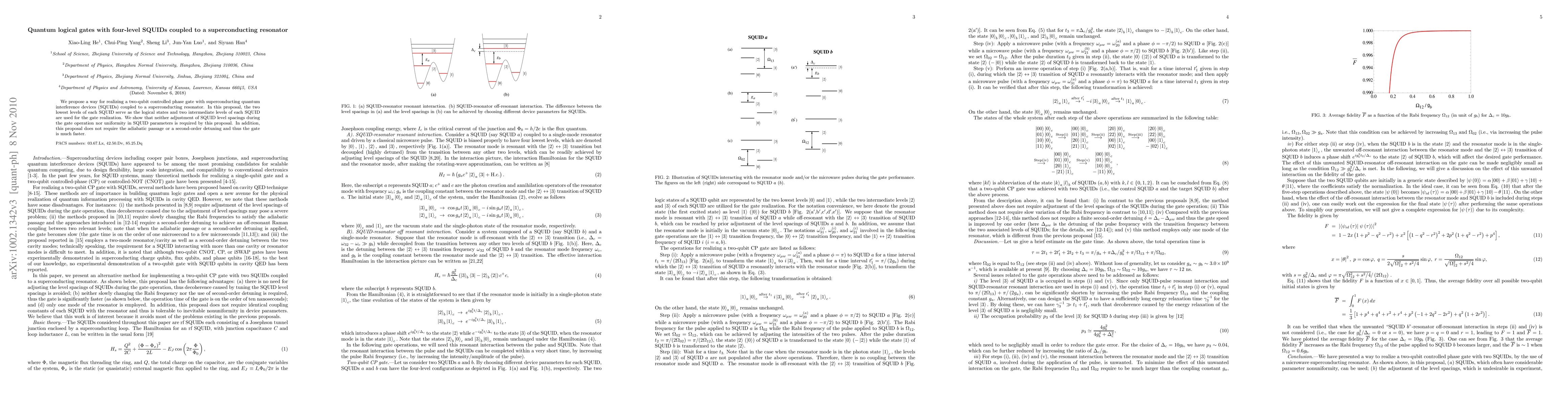 This paper proposes a method for implementing a two-qubit controlled phase gate using four-level SQUIDs coupled to a superconducting resonator, utilizing the two lowest levels as logical states and the two intermediate levels for gate operation. The approach does not require adjustments during gate operation or uniformity in SQUID parameters, and it is faster due to the absence of adiabatic passage or second-order detuning.