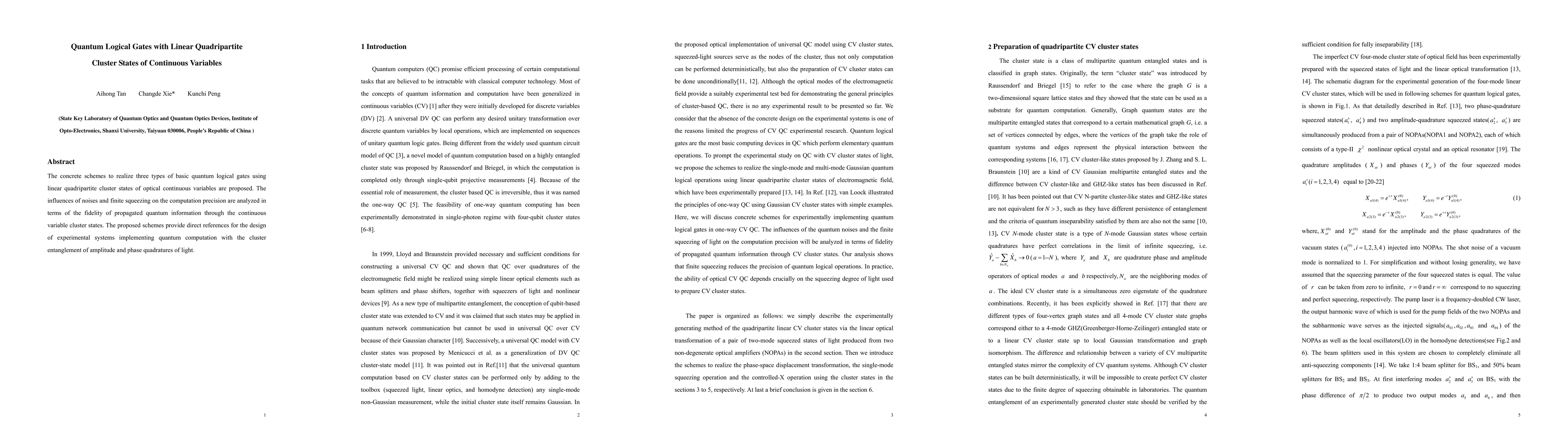 This paper proposes schemes for implementing three basic quantum logical gates using linear quadripartite cluster states of optical continuous variables. It analyzes the impact of noise and finite squeezing on computation precision, providing valuable insights for designing experimental systems for one-way quantum computing.
