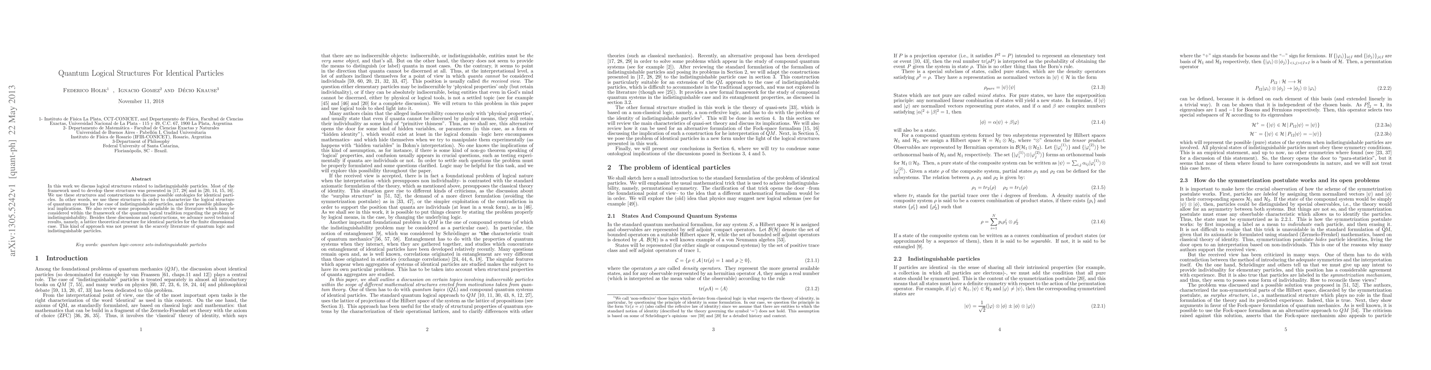 This paper explores logical structures for indistinguishable quantum particles, utilizing frameworks from prior works to characterize their quantum systems and philosophical implications. It introduces a novel lattice theoretical structure for identical particles in finite dimensions, advancing the sparse literature on quantum logic and indistinguishability.