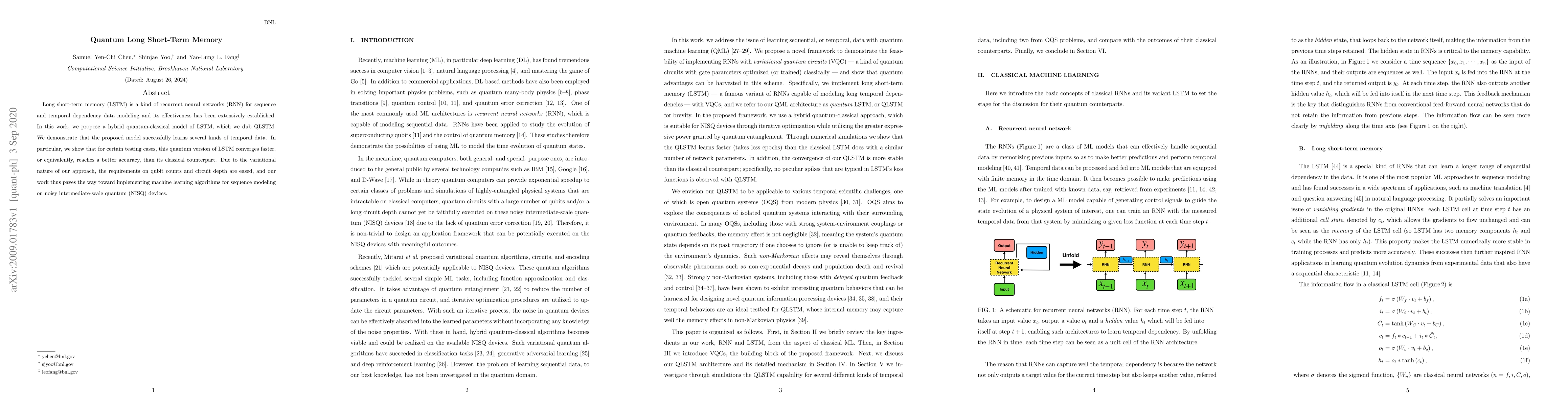 This paper proposes a hybrid quantum-classical model called QLSTM, a quantum version of the long short-term memory (LSTM) neural network. It demonstrates that QLSTM can learn temporal data more efficiently than classical LSTM, potentially enabling practical machine learning on near-term quantum devices.