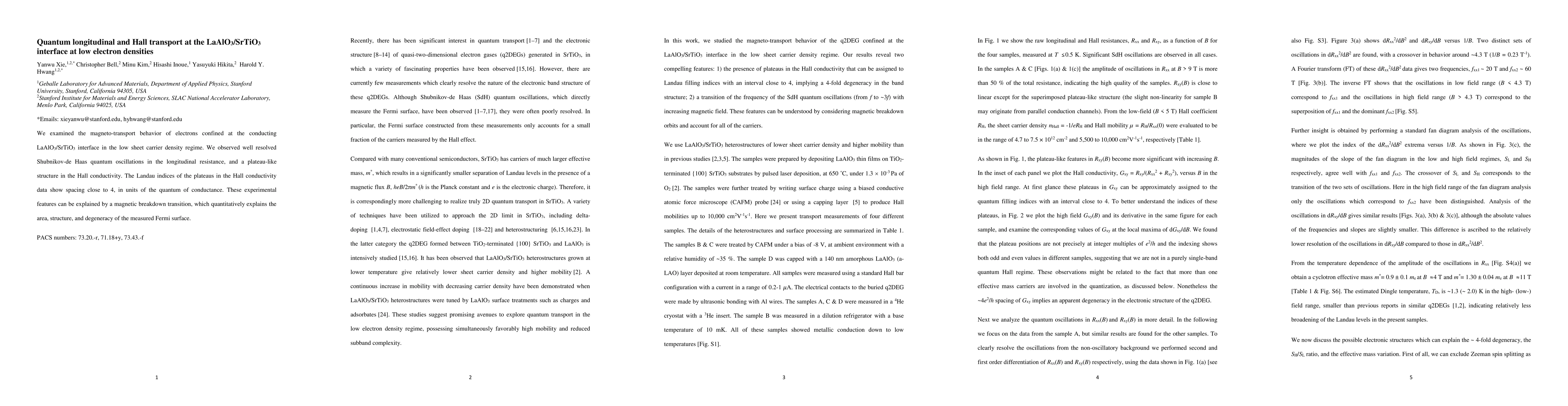 We examined the magneto-transport behavior of electrons confined at the conducting LaAlO3/SrTiO3 interface in the low sheet carrier density regime. We observed well resolved Shubnikov-de Haas quantum oscillations in the longitudinal resistance, and a plateau-like structure in the Hall conductivity. The Landau indices of the plateaus in the Hall conductivity data show spacing close to 4, in units of the quantum of conductance. These experimental features can be explained by a magnetic breakdown transition, which quantitatively explains the area, structure, and degeneracy of the measured Fermi surface.