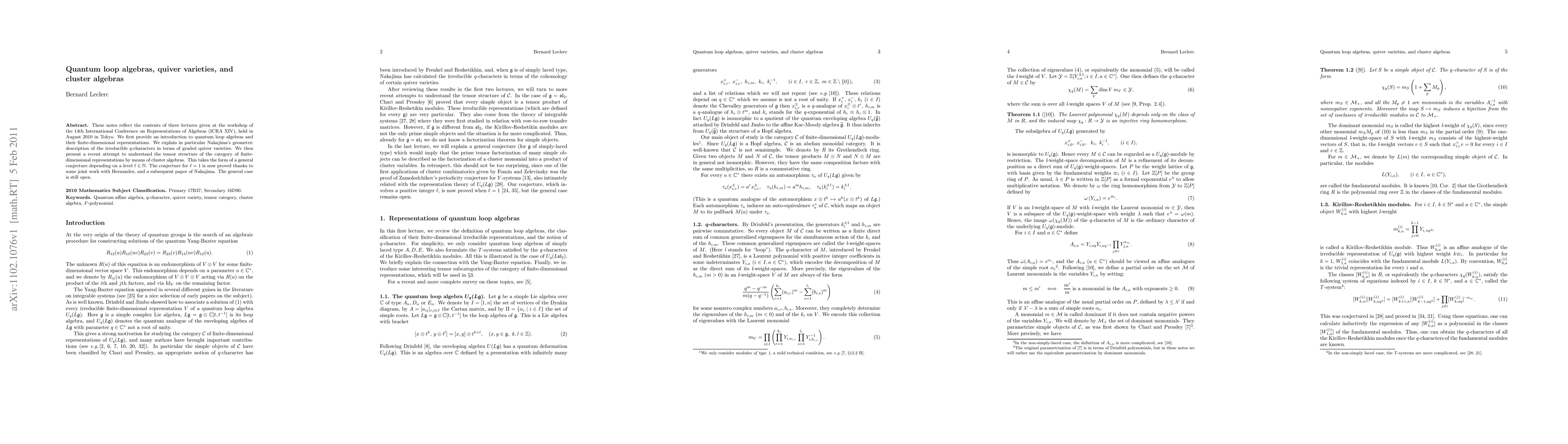 This paper introduces quantum loop algebras and their finite-dimensional representations, linking Nakajima's geometric approach to quiver varieties for q-characters. It further explores the tensor structure of their representation category via cluster algebras.