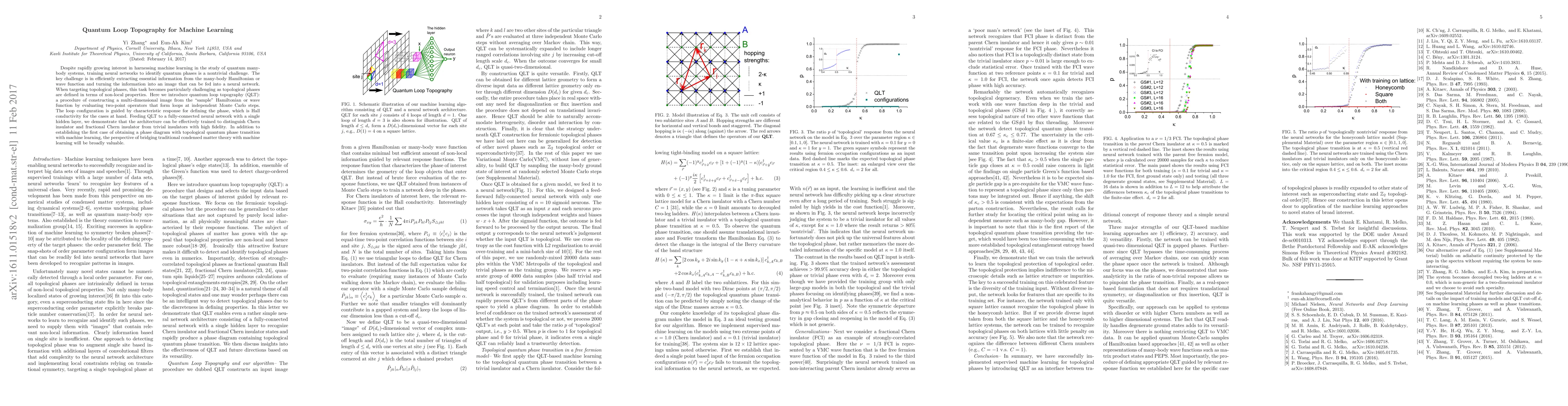Despite rapidly growing interest in harnessing machine learning in the study of quantum many-body systems, training neural networks to identify quantum phases is a nontrivial challenge. The key challenge is in efficiently extracting essential information from the many-body Hamiltonian or wave function and turning the information into an image that can be fed into a neural network. When targeting topological phases, this task becomes particularly challenging as topological phases are defined in terms of non-local properties. Here we introduce quantum loop topography (QLT): a procedure of constructing a multi-dimensional image from the "sample" Hamiltonian or wave function by evaluating two-point operators that form loops at independent Monte Carlo steps. The loop configuration is guided by characteristic response for defining the phase, which is Hall conductivity for the cases at hand. Feeding QLT to a fully-connected neural network with a single hidden layer, we demonstrate that the architecture can be effectively trained to distinguish Chern insulator and fractional Chern insulator from trivial insulators with high fidelity. In addition to establishing the first case of obtaining a phase diagram with topological quantum phase transition with machine learning, the perspective of bridging traditional condensed matter theory with machine learning will be broadly valuable.