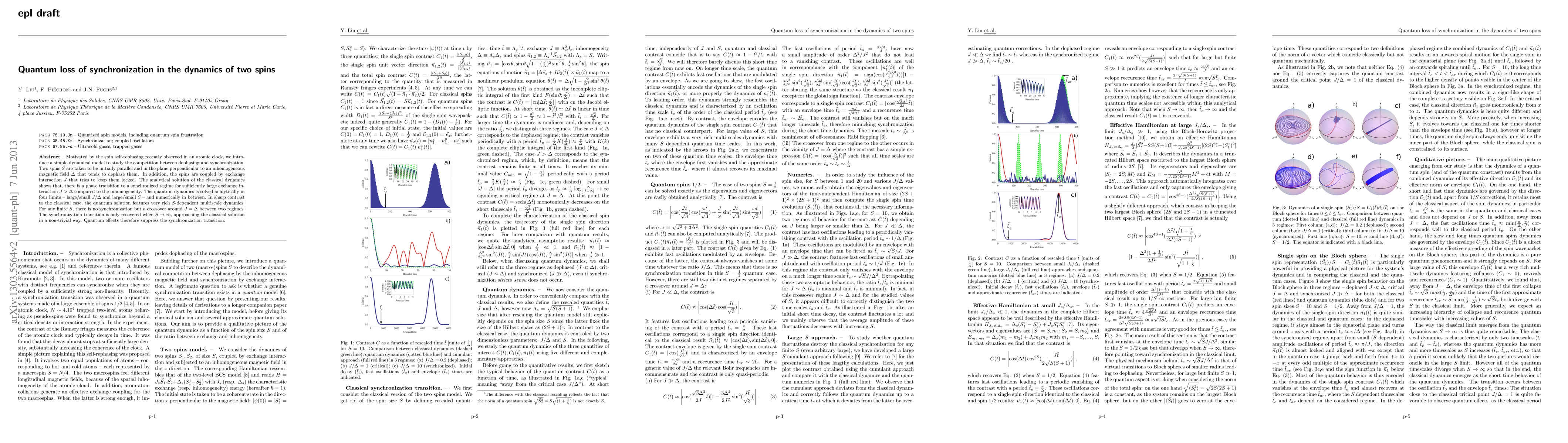 Motivated by the spin self-rephasing recently observed in an atomic clock, we introduce a simple dynamical model to study the competition between dephasing and synchronization. Two spins $S$ are taken to be initially parallel and in the plane perpendicular to an inhomogeneous magnetic field $\Delta$ that tends to dephase them. In addition, the spins are coupled by exchange interaction $J$ that tries to keep them locked. The analytical solution of the classical dynamics shows that, there is a phase transition to a synchronized regime for sufficiently large exchange interaction $J>\Delta$ compared to the inhomogeneity. The quantum dynamics is solved analytically in four limits -- large/small $J/\Delta$ and large/small $S$ -- and numerically in between. In sharp contrast to the classical case, the quantum solution features very rich $S$-dependent multiscale dynamics. For any finite $S$, there is no synchronization but a crossover around $J=\Delta$ between two regimes. The synchronization transition is only recovered when $S\to \infty$, approaching the classical solution in a non-trivial way. Quantum effects therefore suppress the synchronization transition.
