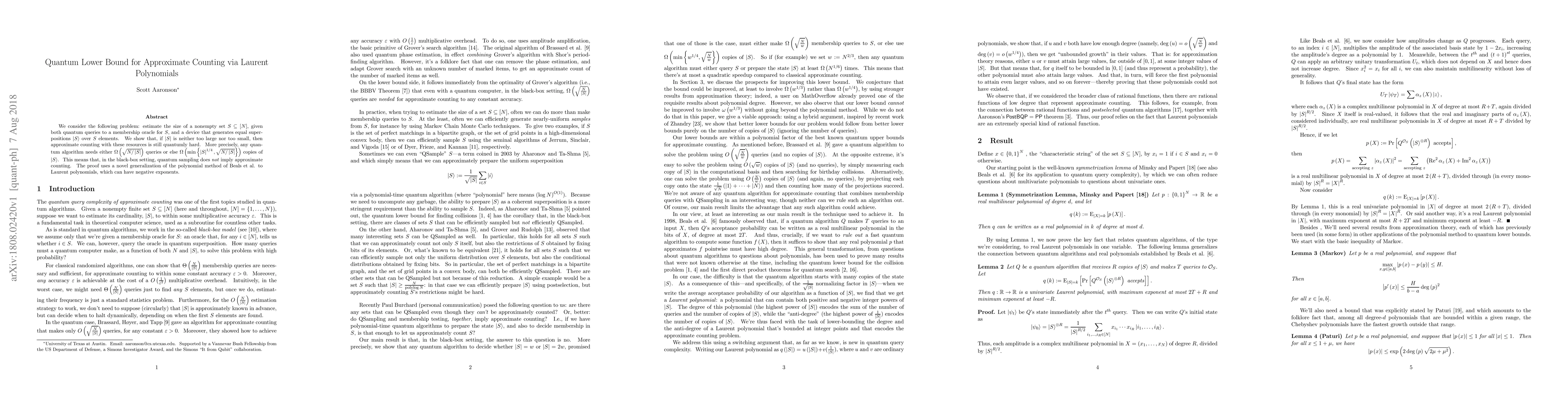 This paper establishes a quantum lower bound for approximate counting using quantum queries and superpositions, showing that it remains hard even with quantum resources. The proof leverages a novel extension of the polynomial method to Laurent polynomials, indicating that quantum sampling does not simplify approximate counting.