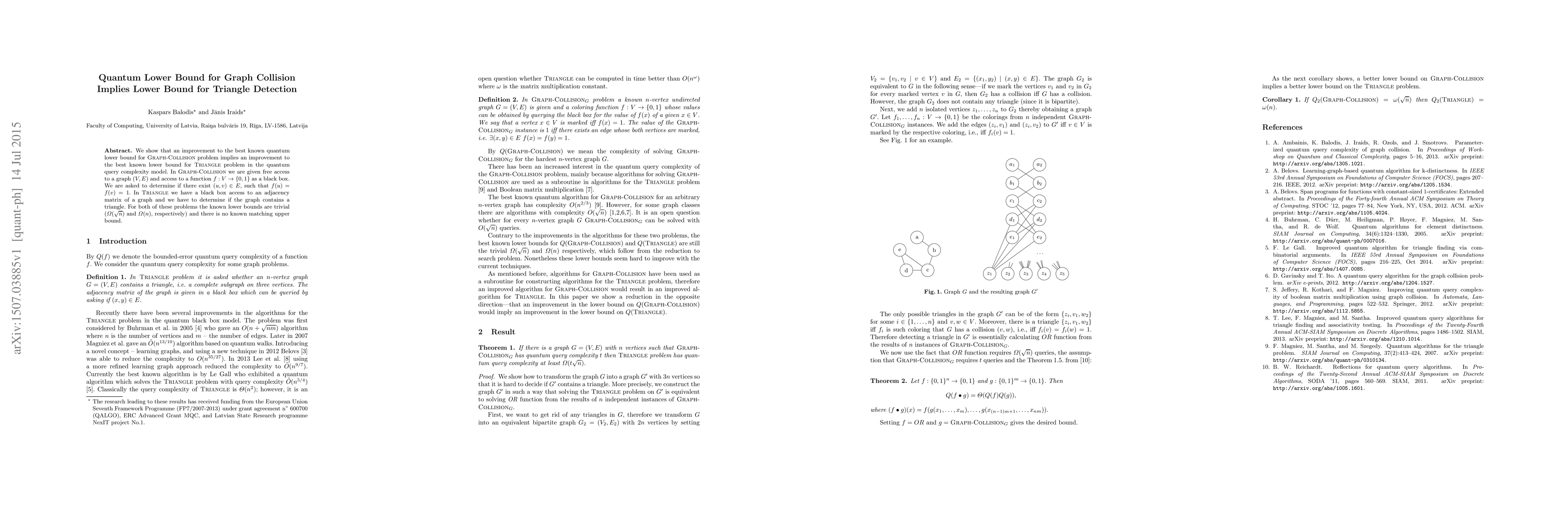 We show that an improvement to the best known quantum lower bound for GRAPH-COLLISION problem implies an improvement to the best known lower bound for TRIANGLE problem in the quantum query complexity model. In GRAPH-COLLISION we are given free access to a graph $(V,E)$ and access to a function $f:V\rightarrow \{0,1\}$ as a black box. We are asked to determine if there exist $(u,v) \in E$, such that $f(u)=f(v)=1$. In TRIANGLE we have a black box access to an adjacency matrix of a graph and we have to determine if the graph contains a triangle. For both of these problems the known lower bounds are trivial ($\Omega(\sqrt{n})$ and $\Omega(n)$, respectively) and there is no known matching upper bound.