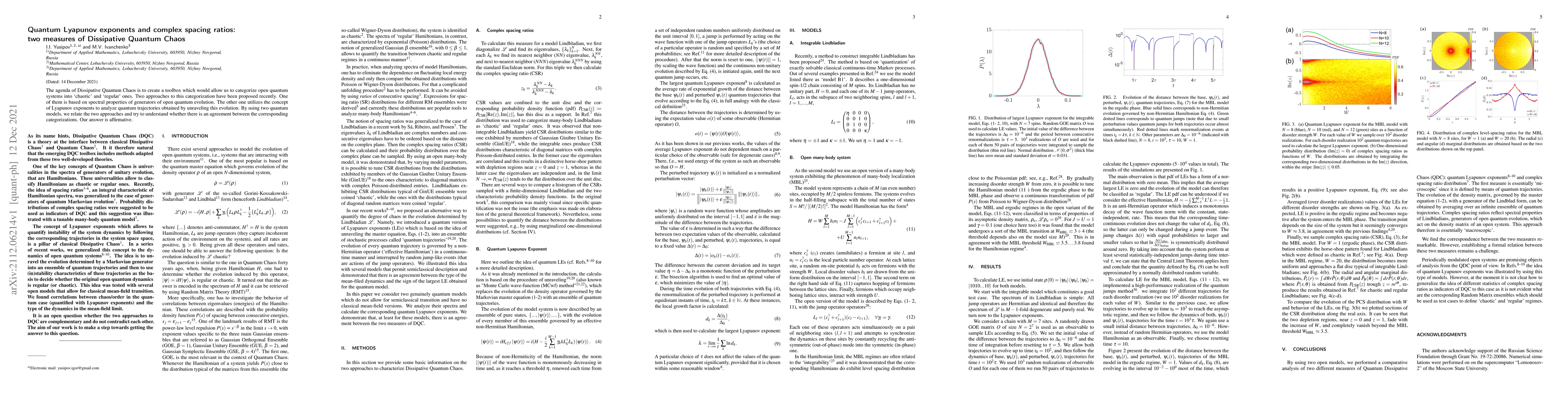 This paper investigates Dissipative Quantum Chaos by comparing two categorization methods: quantum Lyapunov exponents and complex spacing ratios, finding agreement between them in classifying open quantum systems as chaotic or regular.