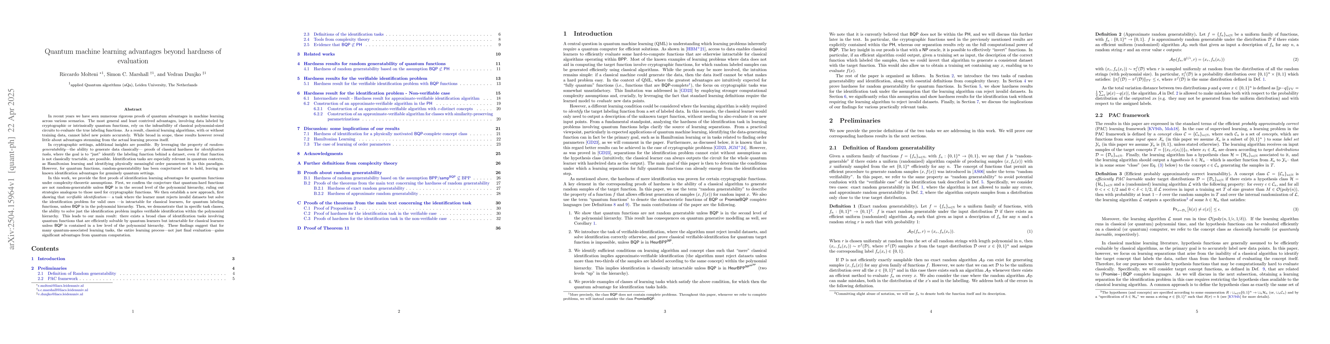 The paper introduces novel theoretical proofs for quantum identification learning advantages, distinguishing between verifiable and non-verifiable identification tasks, and linking these to complexity classes such as BQP and the polynomial hierarchy.