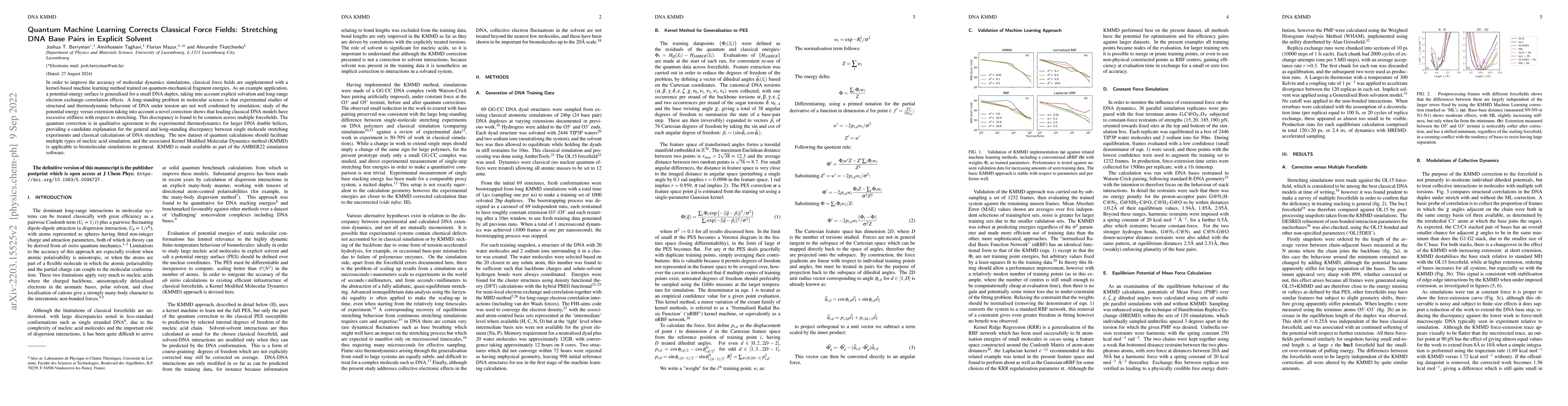 This paper introduces a quantum machine learning method to correct classical force fields for DNA simulations, showing that classical models overestimate DNA stretching stiffness. The Kernel Modified Molecular Dynamics (KMMD) method, trained on quantum-mechanical data, aligns better with experimental DNA stretching thermodynamics and is integrated into AMBER22.