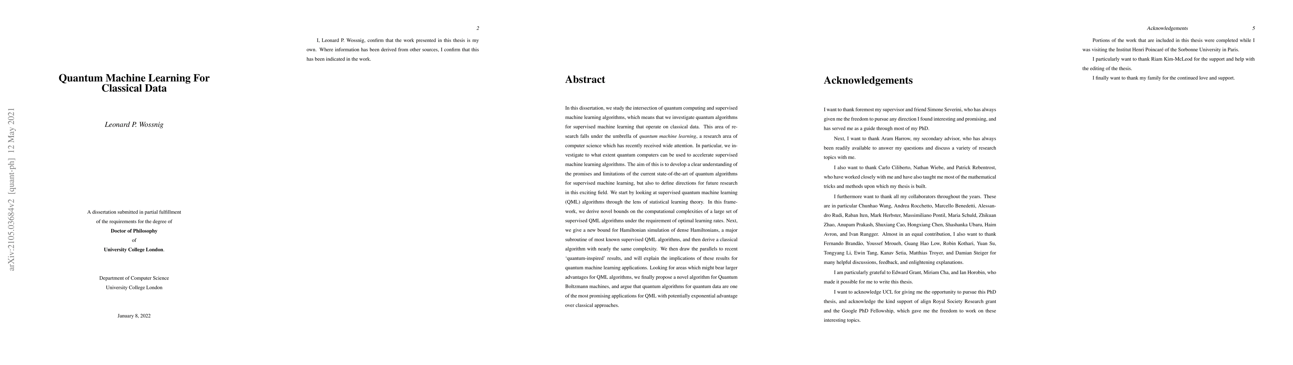 In this dissertation, we study the intersection of quantum computing and supervised machine learning algorithms, which means that we investigate quantum algorithms for supervised machine learning that operate on classical data. This area of research falls under the umbrella of quantum machine learning, a research area of computer science which has recently received wide attention. In particular, we investigate to what extent quantum computers can be used to accelerate supervised machine learning algorithms. The aim of this is to develop a clear understanding of the promises and limitations of the current state of the art of quantum algorithms for supervised machine learning, but also to define directions for future research in this exciting field. We start by looking at supervised quantum machine learning (QML) algorithms through the lens of statistical learning theory. In this framework, we derive novel bounds on the computational complexities of a large set of supervised QML algorithms under the requirement of optimal learning rates. Next, we give a new bound for Hamiltonian simulation of dense Hamiltonians, a major subroutine of most known supervised QML algorithms, and then derive a classical algorithm with nearly the same complexity. We then draw the parallels to recent "quantum-inspired" results, and will explain the implications of these results for quantum machine learning applications. Looking for areas which might bear larger advantages for QML algorithms, we finally propose a novel algorithm for Quantum Boltzmann machines, and argue that quantum algorithms for quantum data are one of the most promising applications for QML with potentially exponential advantage over classical approaches.
