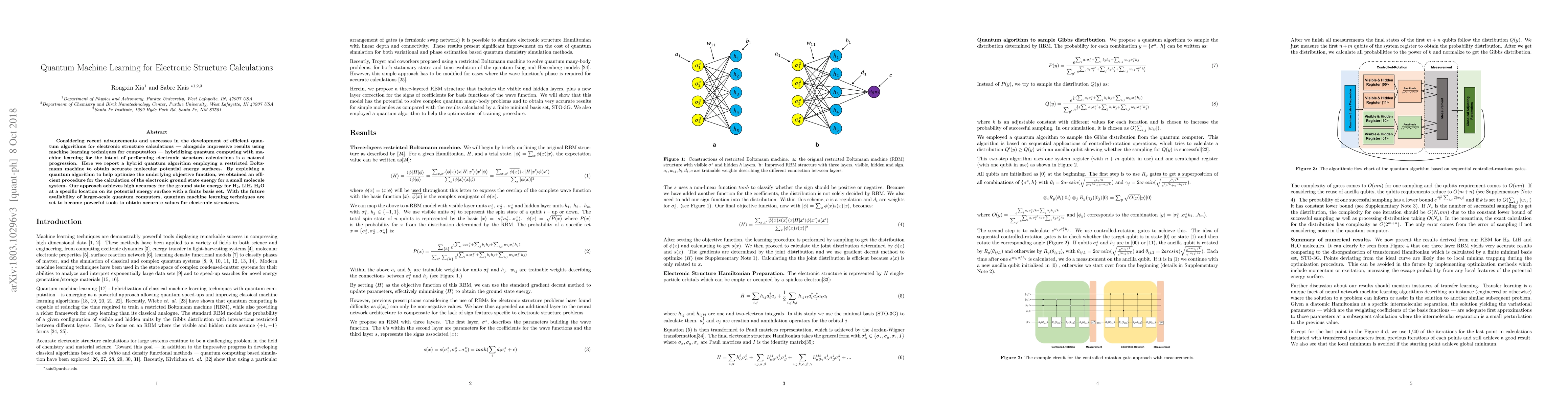 Considering recent advancements and successes in the development of efficient quantum algorithms for electronic structure calculations --- alongside impressive results using machine learning techniques for computation --- hybridizing quantum computing with machine learning for the intent of performing electronic structure calculations is a natural progression. Here we report a hybrid quantum algorithm employing a restricted Boltzmann machine to obtain accurate molecular potential energy surfaces. By exploiting a quantum algorithm to help optimize the underlying objective function, we obtained an efficient procedure for the calculation of the electronic ground state energy for a small molecule system. Our approach achieves high accuracy for the ground state energy for H$_2$, LiH, H$_2$O at a specific location on its potential energy surface with a finite basis set. With the future availability of larger-scale quantum computers, quantum machine learning techniques are set to become powerful tools to obtain accurate values for electronic structures.