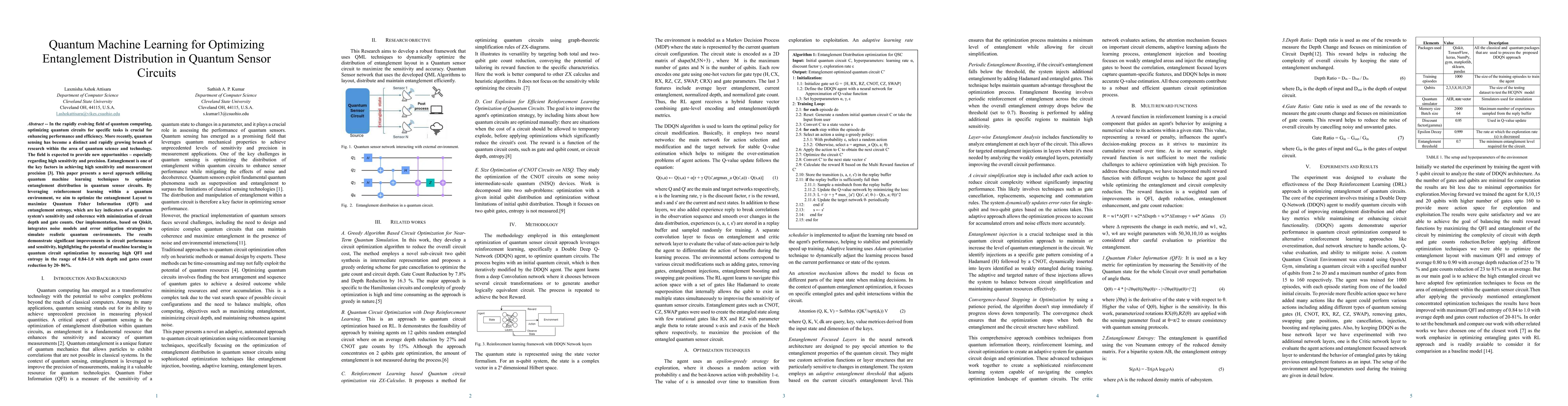 In the rapidly evolving field of quantum computing, optimizing quantum circuits for specific tasks is crucial for enhancing performance and efficiency. More recently, quantum sensing has become a distinct and rapidly growing branch of research within the area of quantum science and technology. The field is expected to provide new opportunities, especially regarding high sensitivity and precision. Entanglement is one of the key factors in achieving high sensitivity and measurement precision [3]. This paper presents a novel approach utilizing quantum machine learning techniques to optimize entanglement distribution in quantum sensor circuits. By leveraging reinforcement learning within a quantum environment, we aim to optimize the entanglement layout to maximize Quantum Fisher Information (QFI) and entanglement entropy, which are key indicators of a quantum system's sensitivity and coherence, while minimizing circuit depth and gate counts. Our implementation, based on Qiskit, integrates noise models and error mitigation strategies to simulate realistic quantum environments. The results demonstrate significant improvements in circuit performance and sensitivity, highlighting the potential of machine learning in quantum circuit optimization by measuring high QFI and entropy in the range of 0.84-1.0 with depth and gate count reduction by 20-86%.