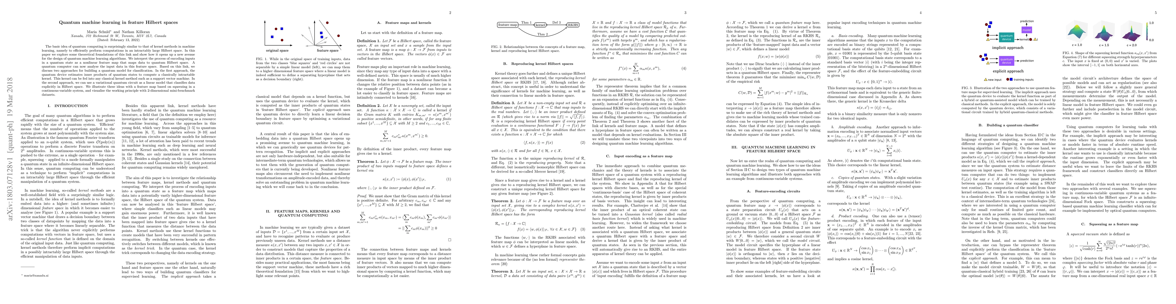 The basic idea of quantum computing is surprisingly similar to that of kernel methods in machine learning, namely to efficiently perform computations in an intractably large Hilbert space. In this paper we explore some theoretical foundations of this link and show how it opens up a new avenue for the design of quantum machine learning algorithms. We interpret the process of encoding inputs in a quantum state as a nonlinear feature map that maps data to quantum Hilbert space. A quantum computer can now analyse the input data in this feature space. Based on this link, we discuss two approaches for building a quantum model for classification. In the first approach, the quantum device estimates inner products of quantum states to compute a classically intractable kernel. This kernel can be fed into any classical kernel method such as a support vector machine. In the second approach, we can use a variational quantum circuit as a linear model that classifies data explicitly in Hilbert space. We illustrate these ideas with a feature map based on squeezing in a continuous-variable system, and visualise the working principle with $2$-dimensional mini-benchmark datasets.
