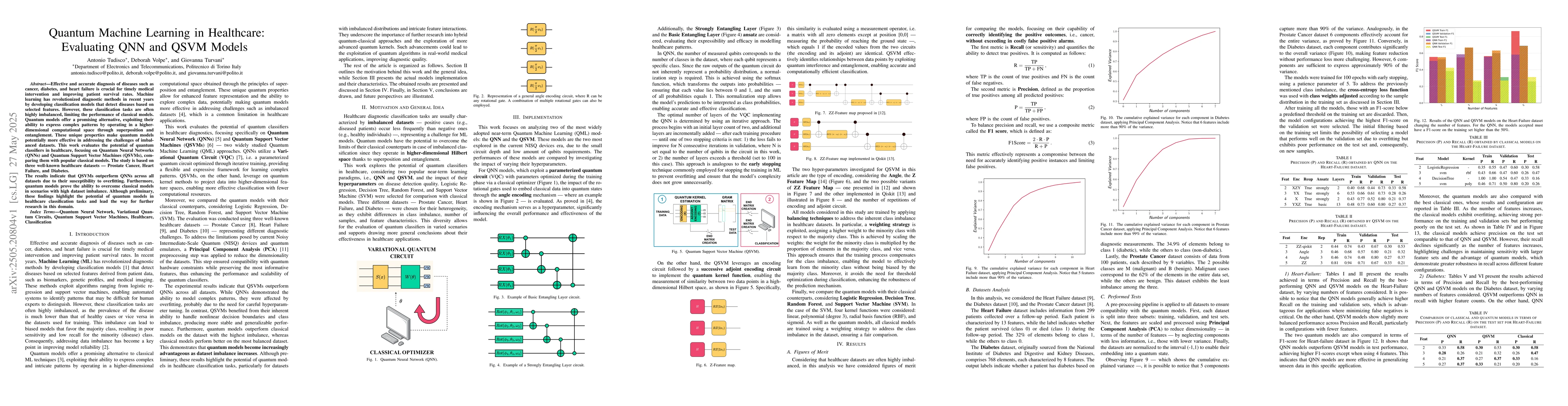 This work is notable for its early exploration of quantum machine learning in healthcare, specifically contrasting QNNs and QSVMs against classical models, and identifying QSVMs' superior performance in imbalanced datasets.