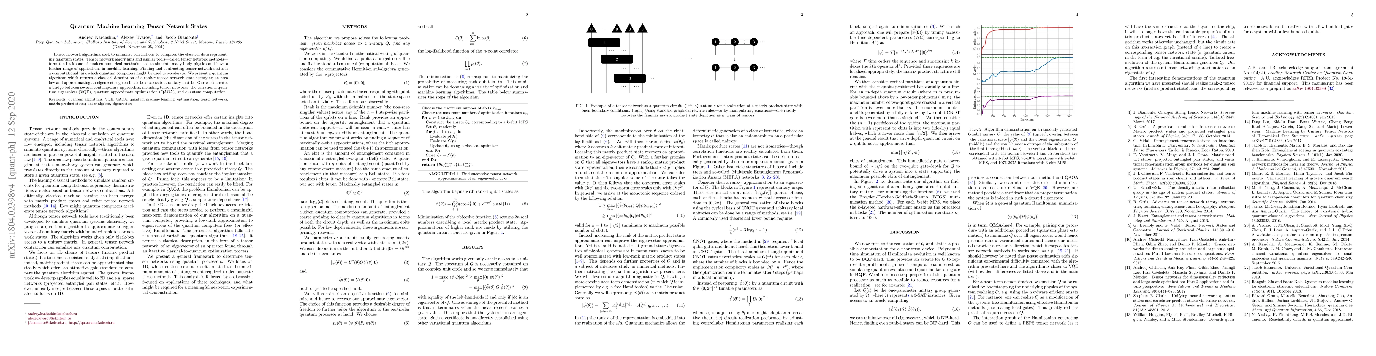 Tensor network algorithms seek to minimize correlations to compress the classical data representing quantum states. Tensor network algorithms and similar tools---called tensor network methods---form the backbone of modern numerical methods used to simulate many-body physics and have a further range of applications in machine learning. Finding and contracting tensor network states is a computational task which quantum computers might be used to accelerate. We present a quantum algorithm which returns a classical description of a rank-$r$ tensor network state satisfying an area law and approximating an eigenvector given black-box access to a unitary matrix. Our work creates a bridge between several contemporary approaches, including tensor networks, the variational quantum eigensolver (VQE), quantum approximate optimization (QAOA), and quantum computation.
