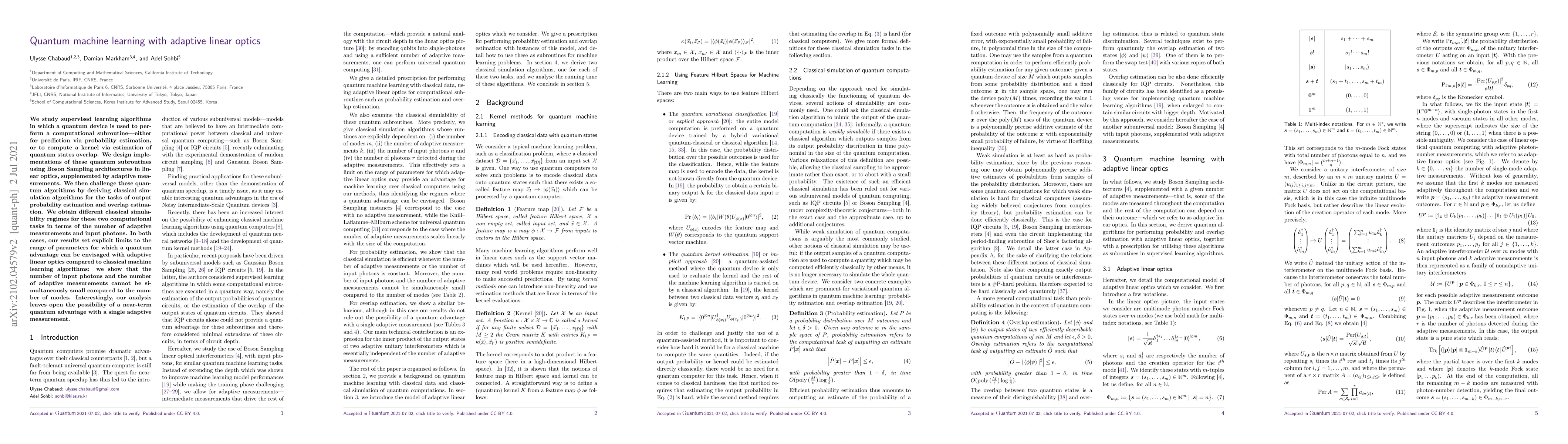 This paper explores quantum machine learning using adaptive linear optics, implementing quantum subroutines via Boson Sampling. It finds that while a quantum advantage is possible, the number of adaptive measurements and input photons cannot both be small, though a single adaptive measurement may offer near-term benefits.