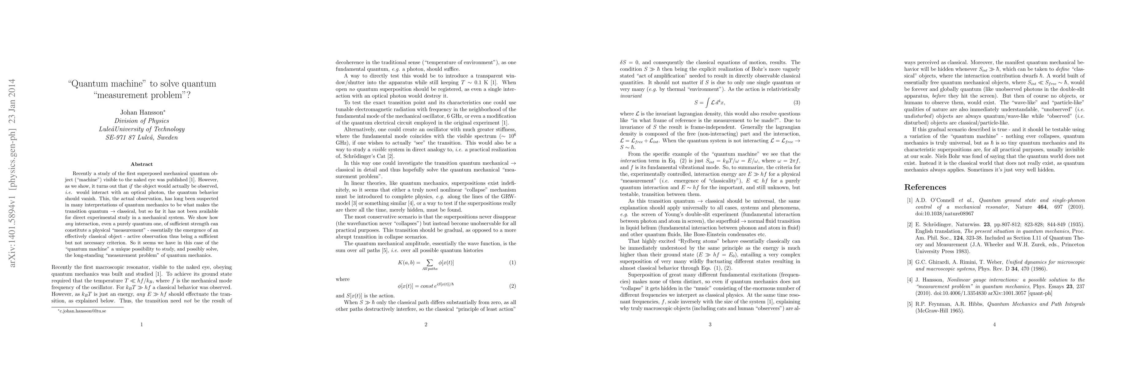Recently a study of the first superposed mechanical quantum object ("machine") visible to the naked eye was published. However, as we show, it turns out that if the object would actually be observed, i.e. would interact with an optical photon, the quantum behavior should vanish. This, the actual observation, has long been suspected in many interpretations of quantum mechanics to be what makes the transition quantum $\rightarrow$ classical, but so far it has not been available for direct experimental study in a mechanical system. We show how any interaction, even a purely quantum one, of sufficient strength can constitute a physical "measurement" - essentially the emergence of an effectively classical object - active observation thus being a sufficient but not necessary criterion. So it seems we have in this case of the "quantum machine" a unique possibility to study, and possibly solve, the long-standing "measurement problem" of quantum mechanics.