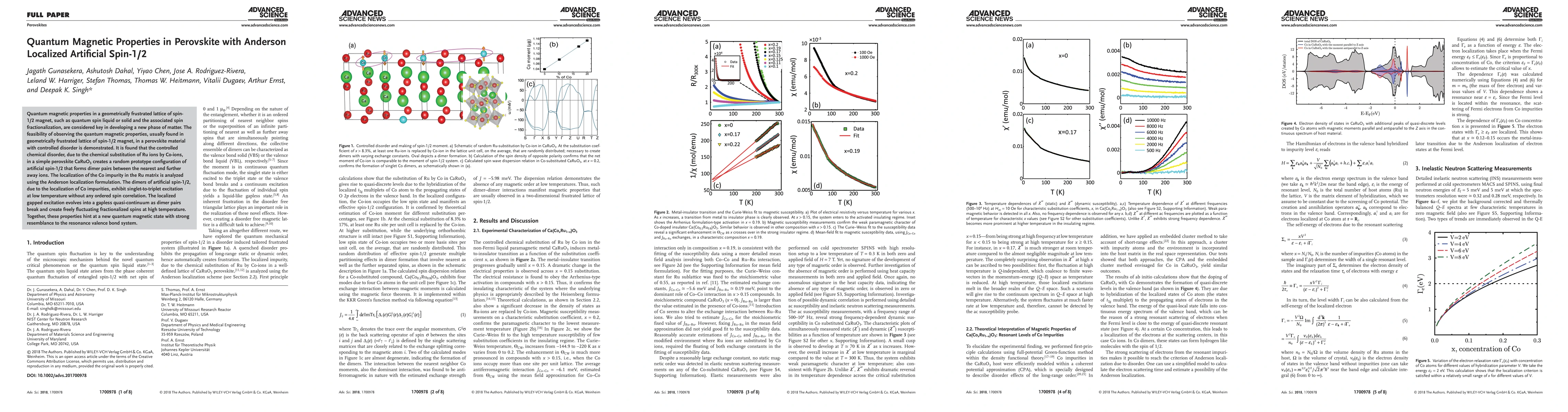 Quantum magnetic properties in a geometrically frustrated lattice of spin-1/2 magnet, such as quantum spin liquid or solid and the associated spin fractionalization, are considered key in developing a new phase of matter. The feasibility of observing the quantum magnetic properties, usually found in geometrically frustrated lattice of spin-1/2 magnet, in a perovskite material with controlled disorder is demonstrated. It is found that the controlled chemical disorder, due to the chemical substitution of Ru ions by Co-ions, in a simple perovskite CaRuO3 creates a random prototype configuration of artificial spin-1/2 that forms dimer pairs between the nearest and further away ions. The localization of the Co impurity in the Ru matrix is analyzed using the Anderson localization formulation. The dimers of artificial spin-1/2, due to the localization of Co impurities, exhibit singlet-to-triplet excitation at low temperature without any ordered spin correlation. The localized gapped excitation evolves into a gapless quasi-continuum as dimer pairs break and create freely fluctuating fractionalized spins at high temperature. Together, these properties hint at a new quantum magnetic state with strong resemblance to the resonance valence bond system.