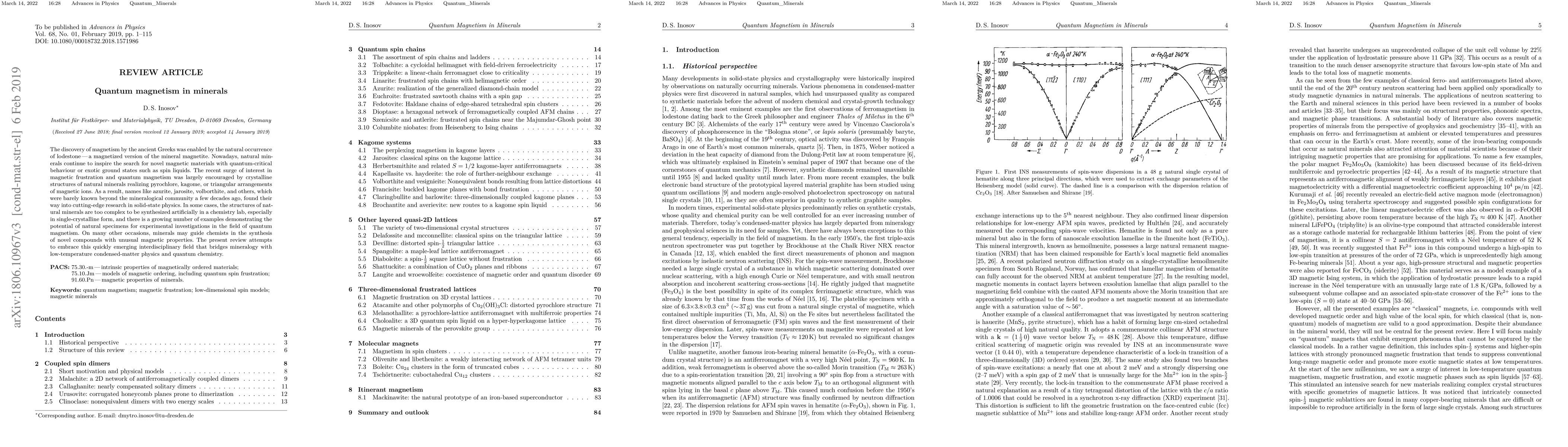 The discovery of magnetism by the ancient Greeks was enabled by the natural occurrence of lodestone -- a magnetized version of the mineral magnetite. Nowadays, natural minerals continue to inspire the search for novel magnetic materials with quantum-critical behavior or exotic ground states such as spin liquids. The recent surge of interest in magnetic frustration and quantum magnetism was largely encouraged by crystalline structures of natural minerals realizing pyrochlore, kagome, or triangular arrangements of magnetic ions. As a result, names like azurite, jarosite, volborthite, and others, which were barely known beyond the mineralogical community a few decades ago, found their way into cutting-edge research in solid-state physics. In some cases, the structures of natural minerals are too complex to be synthesized artificially in a chemistry lab, especially in single-crystalline form, and there is a growing number of examples demonstrating the potential of natural specimens for experimental investigations in the field of quantum magnetism. On many other occasions, minerals may guide chemists in the synthesis of novel compounds with unusual magnetic properties. The present review attempts to embrace this quickly emerging interdisciplinary field that bridges mineralogy with low-temperature condensed-matter physics and quantum chemistry.