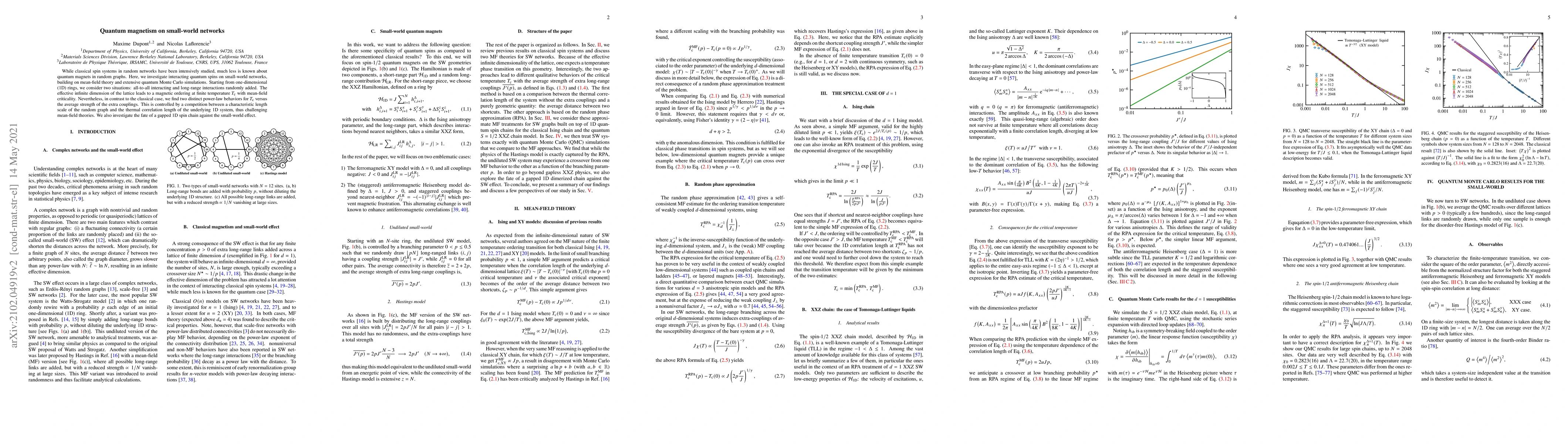 While classical spin systems in random networks have been intensively studied, much less is known about quantum magnets in random graphs. Here, we investigate interacting quantum spins on small-world networks, building on mean-field theory and extensive quantum Monte Carlo simulations. Starting from one-dimensional (1D) rings, we consider two situations: all-to-all interacting and long-range interactions randomly added. The effective infinite dimension of the lattice leads to a magnetic ordering at finite temperature $T_\mathrm{c}$ with mean-field criticality. Nevertheless, in contrast to the classical case, we find two distinct power-law behaviors for $T_\mathrm{c}$ versus the average strength of the extra couplings. This is controlled by a competition between a characteristic length scale of the random graph and the thermal correlation length of the underlying 1D system, thus challenging mean-field theories. We also investigate the fate of a gapped 1D spin chain against the small-world effect.