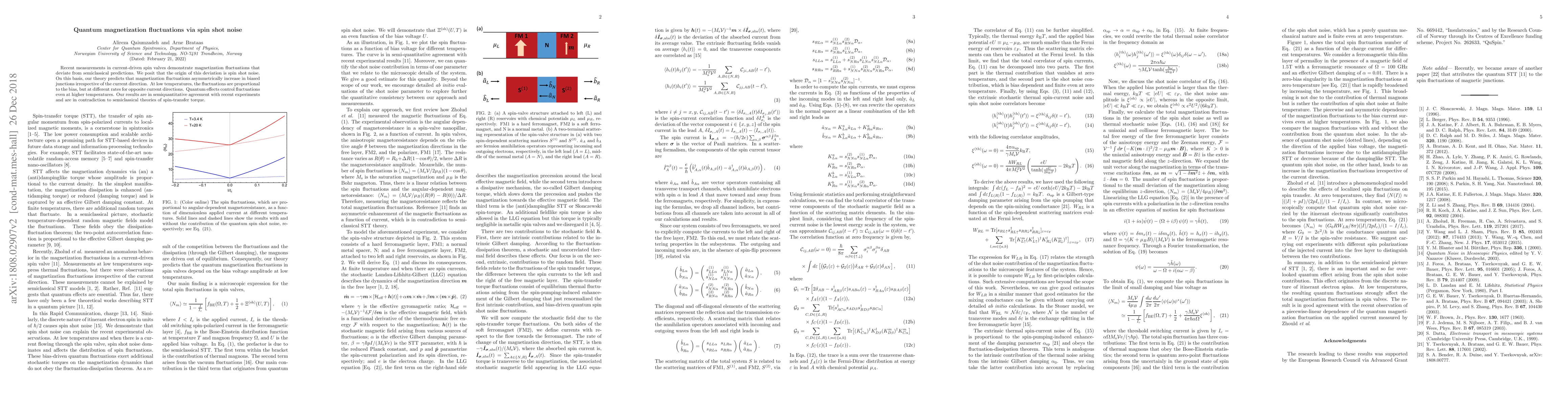 This paper proposes that spin shot noise explains magnetization fluctuations in current-driven spin valves, predicting asymmetrical increases in fluctuations based on current direction. Quantum effects dominate these fluctuations even at higher temperatures, contradicting semiclassical spin-transfer torque theories and aligning semiquantitatively with recent experimental data.