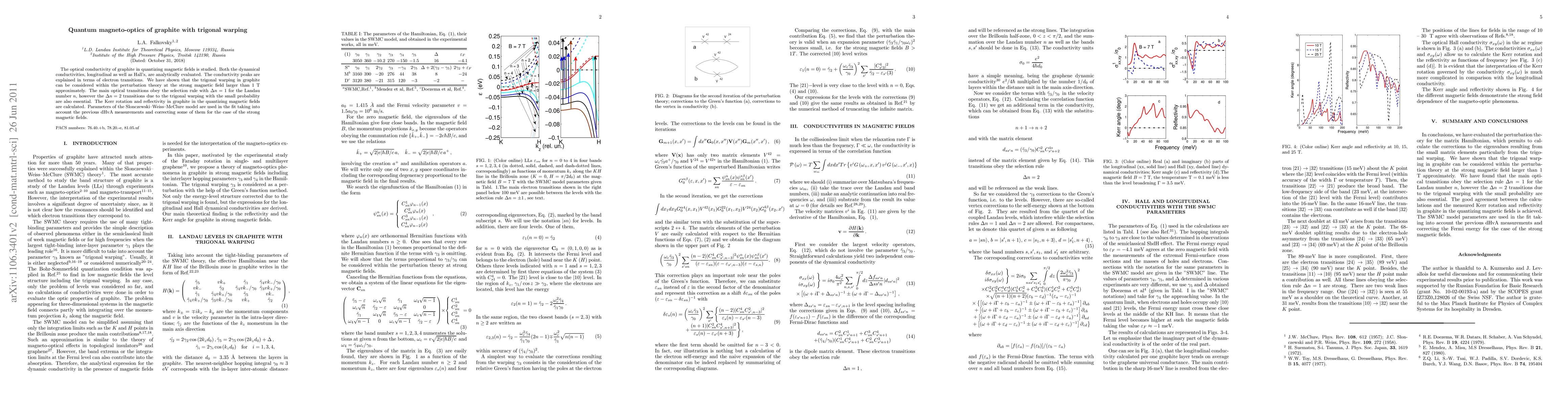 This paper investigates the optical conductivity of graphite under quantizing magnetic fields, revealing significant conductivity peaks due to electron transitions and the influence of trigonal warping. The study shows that trigonal warping effects can be analyzed using perturbation theory in strong magnetic fields, and it calculates Kerr rotation and reflectivity, fitting parameters to the Slonczewski--Weiss--McClure model.