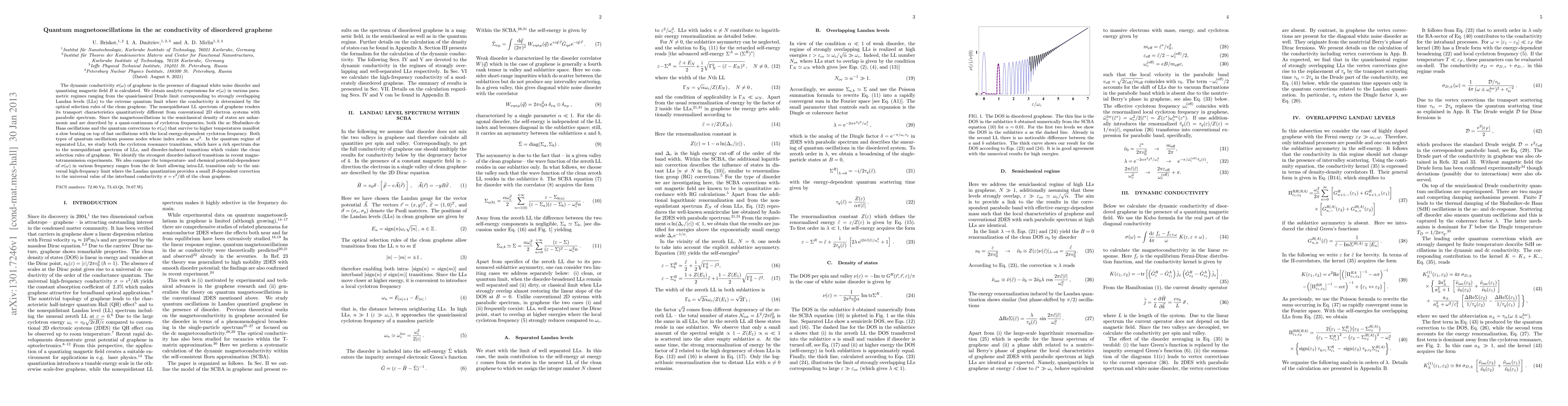 Researchers studied quantum magnetooscillations in disordered graphene, finding slow beating oscillations with local energy-dependent cyclotron frequency on top of fast oscillations, and disorder-induced transitions that violate clean selection rules.