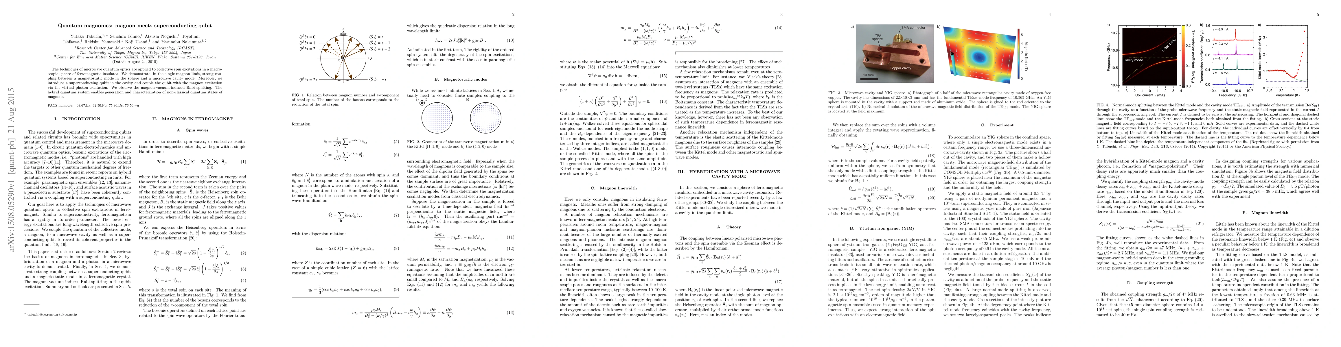 The techniques of microwave quantum optics are applied to collective spin excitations in a macroscopic sphere of ferromagnetic insulator. We demonstrate, in the single-magnon limit, strong coupling between a magnetostatic mode in the sphere and a microwave cavity mode. Moreover, we introduce a superconducting qubit in the cavity and couple the qubit with the magnon excitation via the virtual photon excitation. We observe the magnon-vacuum-induced Rabi splitting. The hybrid quantum system enables generation and characterization of non-classical quantum states of magnons.