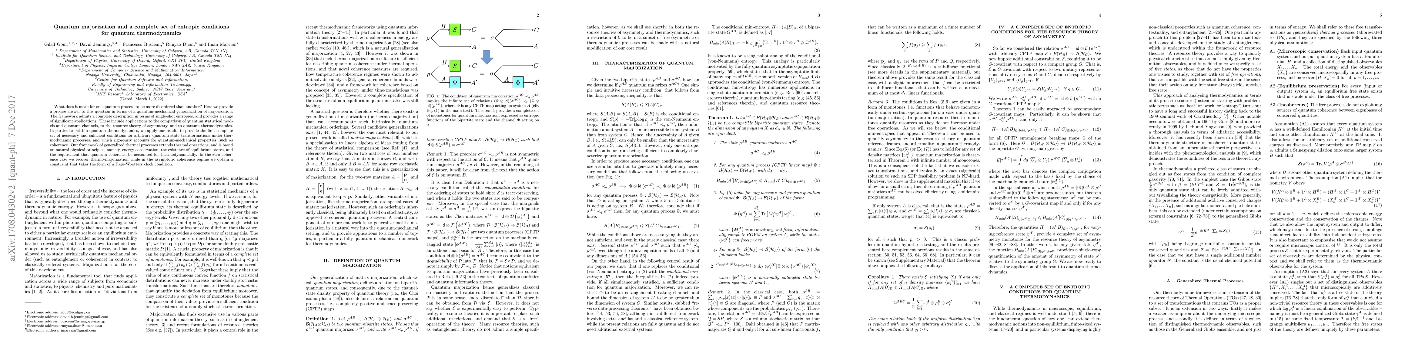 This paper introduces a quantum-mechanical generalization of majorization to quantify the disorder of quantum processes, providing a complete set of entropic conditions for quantum thermodynamics. It extends thermal operations based on energy conservation, equilibrium states, and coherence, offering applications in quantum statistical models, channels, asymmetry, and thermodynamics.