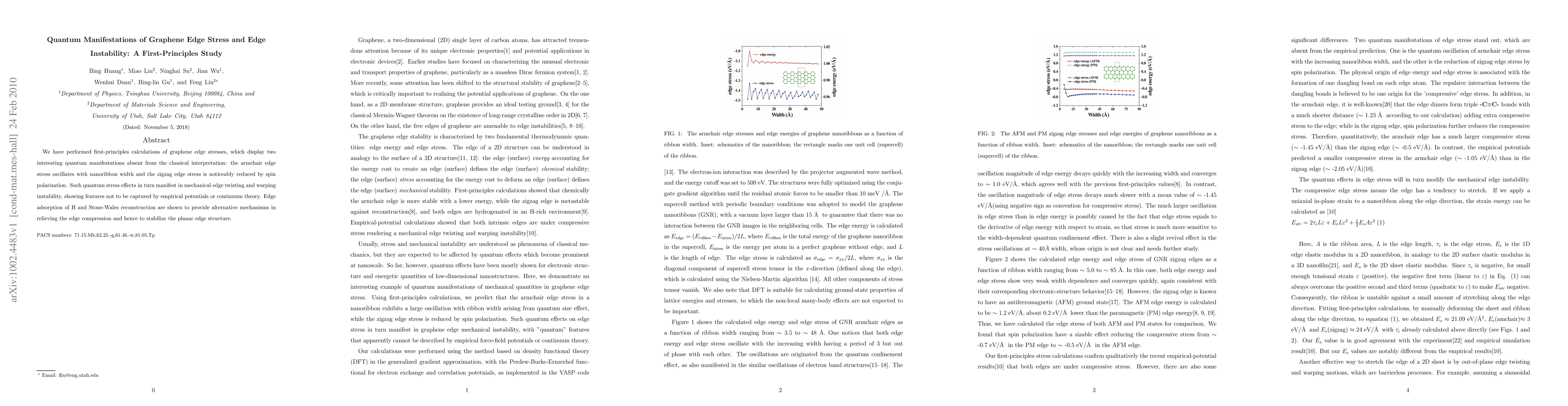 Summary: First-principles calculations reveal quantum effects in graphene edge stresses, including oscillatory armchair edge stress with ribbon width and reduced zigzag stress via spin polarization, leading to unique mechanical instabilities not predicted by classical models, with stabilization mechanisms via H adsorption and Stone-Wales reconstruction.