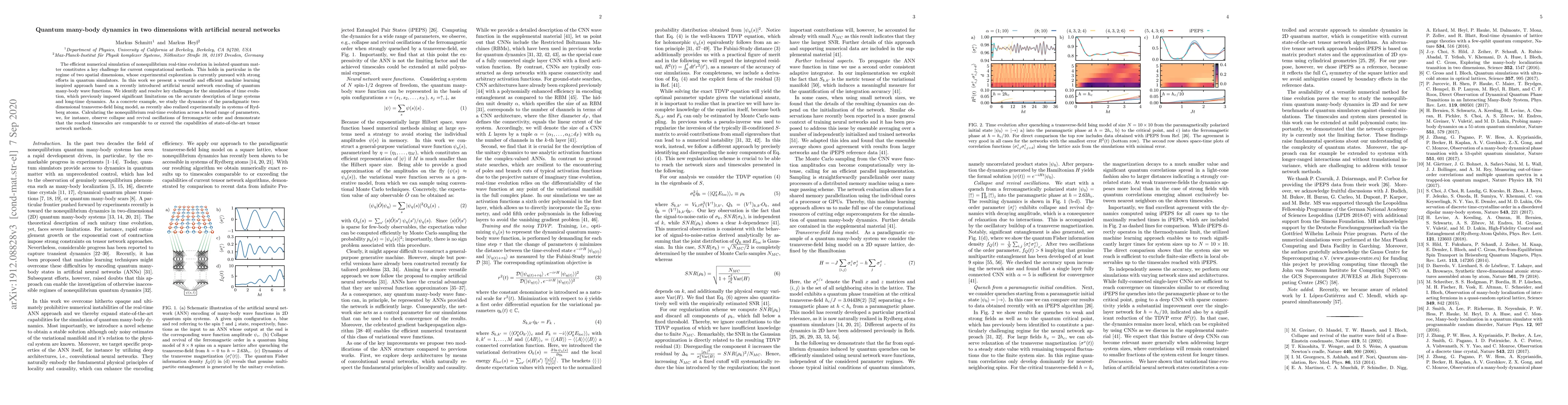 The efficient numerical simulation of nonequilibrium real-time evolution in isolated quantum matter constitutes a key challenge for current computational methods. This holds in particular in the regime of two spatial dimensions, whose experimental exploration is currently pursued with strong efforts in quantum simulators. In this work we present a versatile and efficient machine learning inspired approach based on a recently introduced artificial neural network encoding of quantum many-body wave functions. We identify and resolve some key challenges for the simulation of time evolution, which previously imposed significant limitations on the accurate description of large systems and long-time dynamics. As a concrete example, we study the dynamics of the paradigmatic two-dimensional transverse field Ising model, as recently also realized experimentally in systems of Rydberg atoms. Calculating the nonequilibrium real-time evolution across a broad range of parameters, we, for instance, observe collapse and revival oscillations of ferromagnetic order and demonstrate that the reached time scales are comparable to or exceed the capabilities of state-of-the-art tensor network methods.