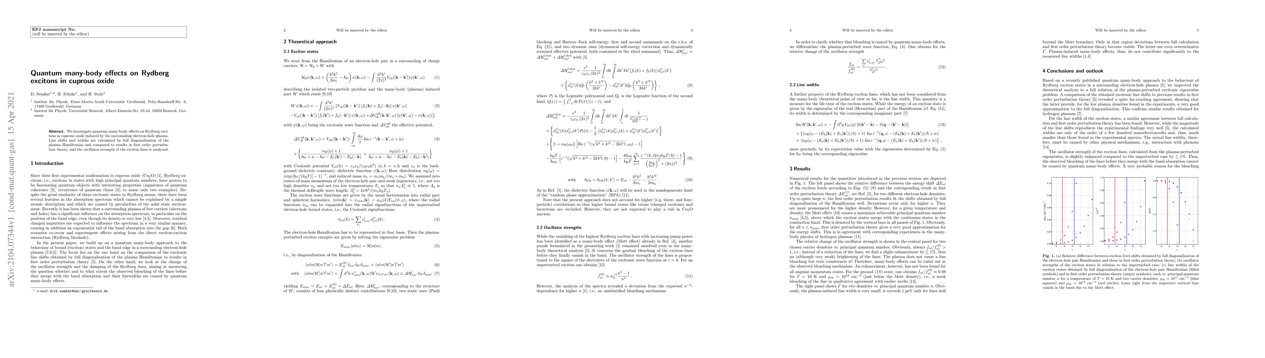This research explores quantum many-body effects on Rydberg excitons in cuprous oxide due to the surrounding electron-hole plasma, employing full diagonalization of the plasma Hamiltonian and comparing results to first-order perturbation theory to analyze line shifts, widths, and oscillator strength.