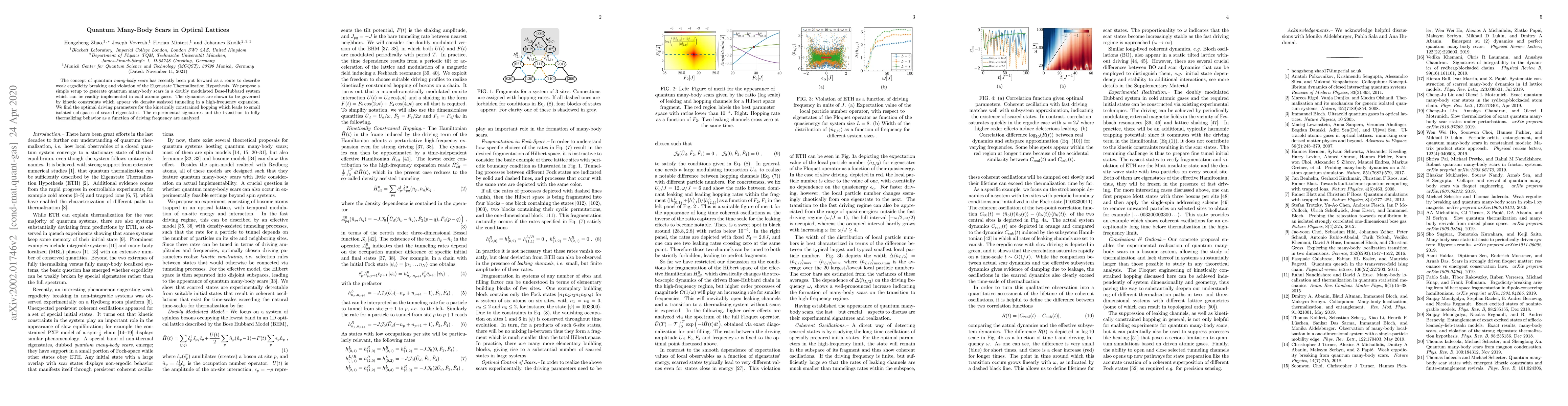Summary: The paper proposes a Bose-Hubbard model in doubly modulated optical lattices to demonstrate quantum many-body scars, revealing kinetic constraints through density-assisted tunneling, and analyzes its transition to thermalizing behavior under varying driving frequencies. Experimental signatures of these scarred eigenstates are also discussed.