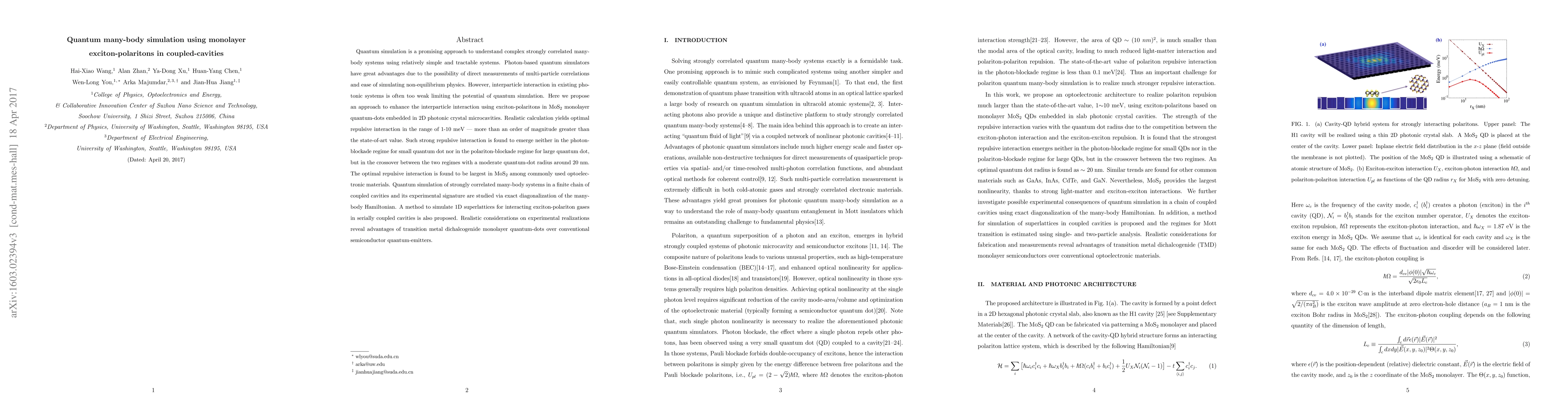 This paper proposes a quantum simulation method using monolayer exciton-polaritons in coupled-cavities, achieving strong interparticle interactions up to 10 meV, significantly enhancing the potential for simulating strongly correlated many-body systems. The optimal interaction occurs in the crossover regime between photon-blockade and polariton-blockade, with MoS$_2$ monolayer quantum-dots showing the best performance.