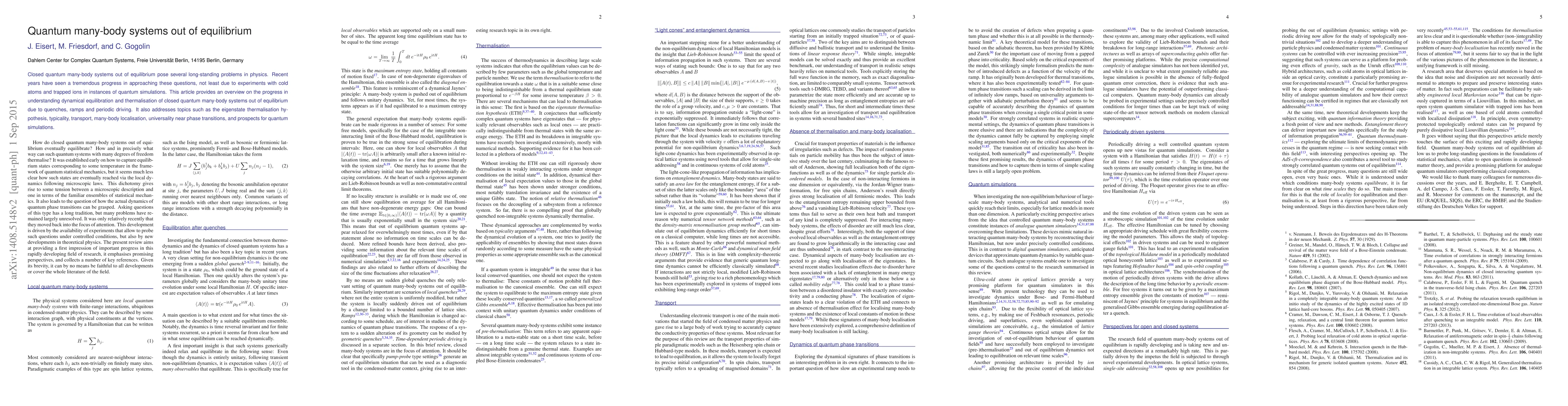 Closed quantum many-body systems out of equilibrium pose several long-standing problems in physics. Recent years have seen a tremendous progress in approaching these questions, not least due to experiments with cold atoms and trapped ions in instances of quantum simulations. This article provides an overview on the progress in understanding dynamical equilibration and thermalisation of closed quantum many-body systems out of equilibrium due to quenches, ramps and periodic driving. It also addresses topics such as the eigenstate thermalisation hypothesis, typicality, transport, many-body localisation, universality near phase transitions, and prospects for quantum simulations.