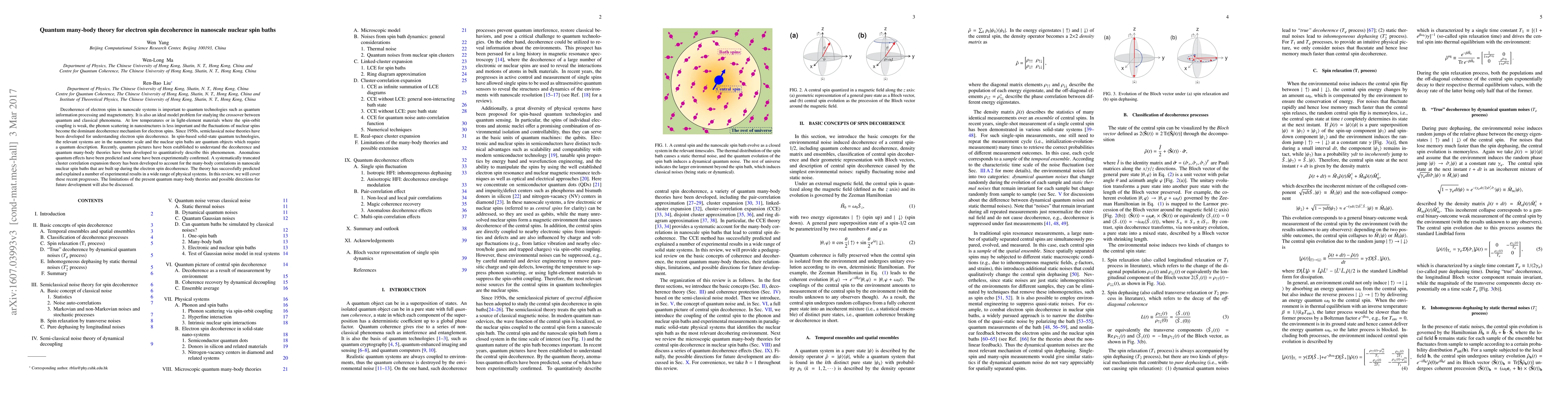 This paper reviews recent advances in quantum many-body theories for understanding electron spin decoherence in nanoscale nuclear spin baths, emphasizing the importance of quantum descriptions over semiclassical models. It highlights the development of a truncated cluster correlation expansion theory to account for many-body correlations and discusses its successful predictions and experimental validations, along with future research directions.