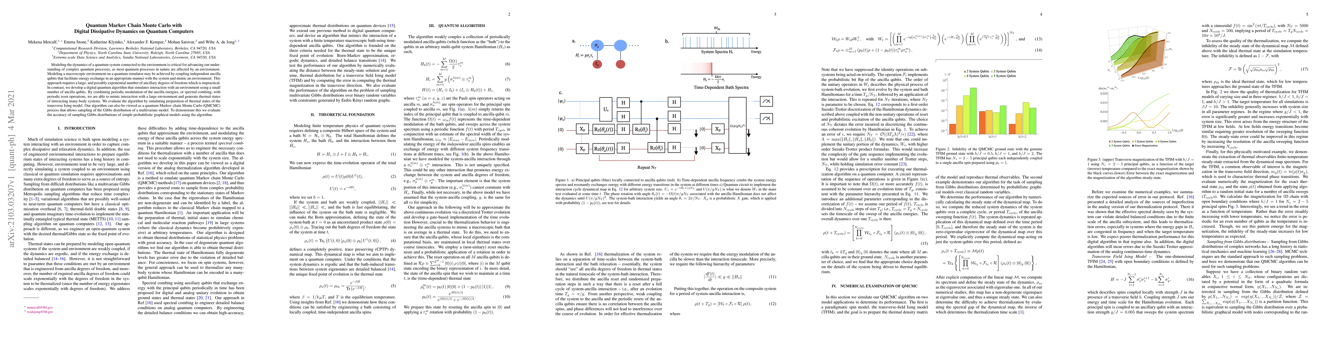 Modeling the dynamics of a quantum system connected to the environment is critical for advancing our understanding of complex quantum processes, as most quantum processes in nature are affected by an environment. Modeling a macroscopic environment on a quantum simulator may be achieved by coupling independent ancilla qubits that facilitate energy exchange in an appropriate manner with the system and mimic an environment. This approach requires a large, and possibly exponential number of ancillary degrees of freedom which is impractical. In contrast, we develop a digital quantum algorithm that simulates interaction with an environment using a small number of ancilla qubits. By combining periodic modulation of the ancilla energies, or spectral combing, with periodic reset operations, we are able to mimic interaction with a large environment and generate thermal states of interacting many-body systems. We evaluate the algorithm by simulating preparation of thermal states of the transverse Ising model. Our algorithm can also be viewed as a quantum Markov chain Monte Carlo (QMCMC) process that allows sampling of the Gibbs distribution of a multivariate model. To demonstrate this we evaluate the accuracy of sampling Gibbs distributions of simple probabilistic graphical models using the algorithm.