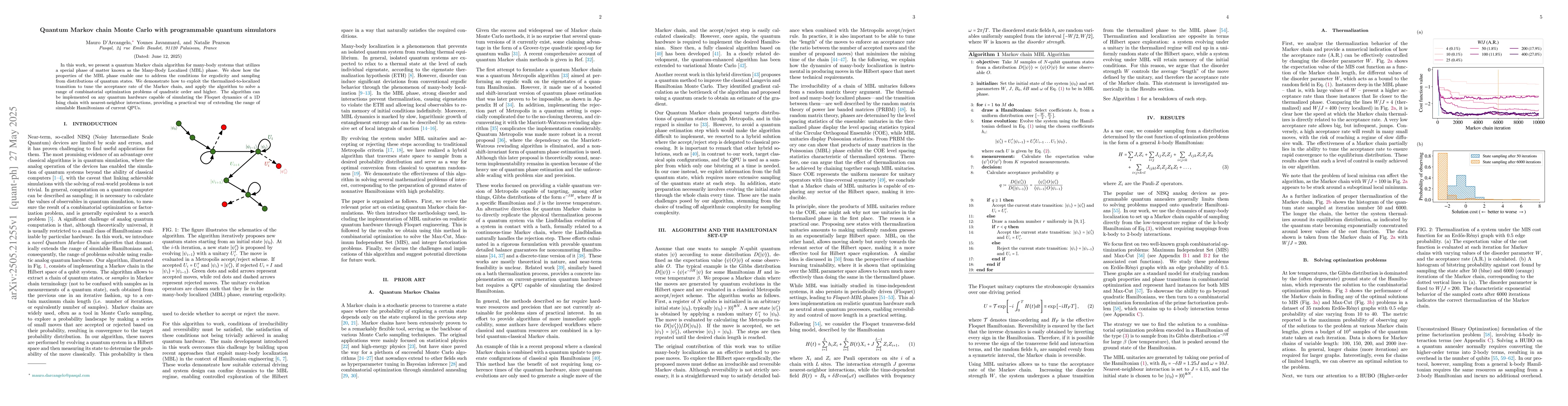 The research presents a quantum Markov chain algorithm leveraging the Many-Body Localized (MBL) phase, exploiting its properties to address ergodicity and sampling from quantum state distributions. The algorithm utilizes the thermalized-to-localized transition to tune the Markov chain's acceptance rate, applicable to various combinatorial optimization problems.