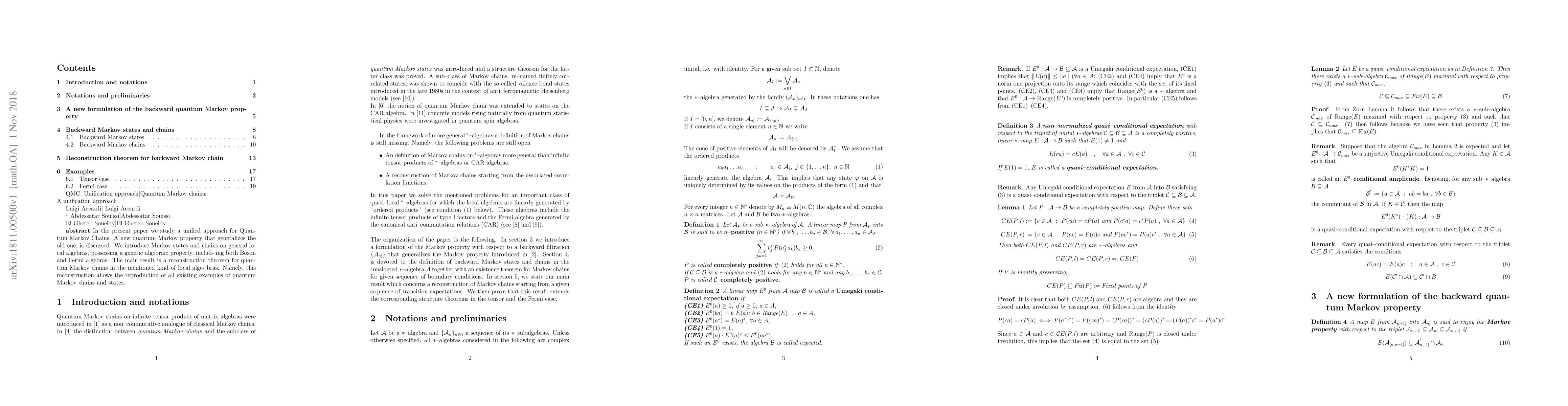 This paper proposes a unified framework for Quantum Markov Chains, introducing a generalized quantum Markov property and Markov states on general local algebras, including both Boson and Fermi algebras. The key result is a reconstruction theorem that can reproduce all known examples of quantum Markov chains and states within this framework.