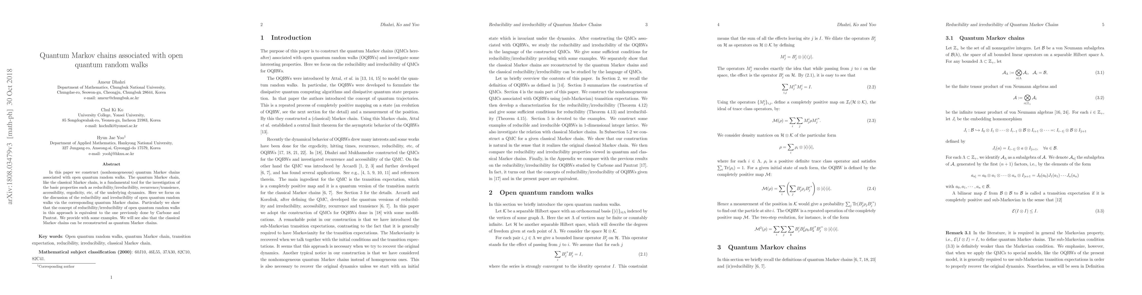 Researchers create a method to analyze open quantum random walks using quantum Markov chains, showing that reducibility and irreducibility can be compared and reconciled with classical Markov chain methods.