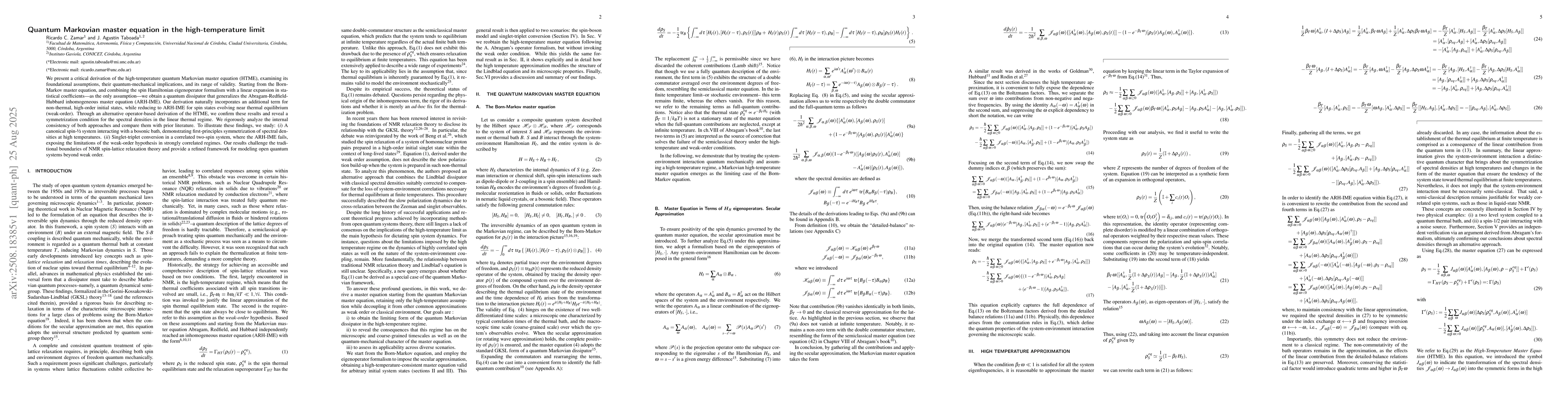 We present a critical derivation of the high-temperature quantum Markovian master equation (HTME), examining its foundational assumptions, their quantum-mechanical implications, and its range of validity. Starting from the Born-Markov master equation, and combining the spin Hamiltonian eigenoperator formalism with a linear expansion in statistical coefficients, as the only assumption, we obtain a quantum dissipator that generalizes the Abragam-Redfield-Hubbard inhomogeneous master equation (ARH-IME). Our derivation naturally incorporates an additional term for non-thermal, high-order initial states, while reducing to ARH-IME for spin states evolving near thermal equilibrium (weak-order). Through an alternative operator-based derivation of the HTME, we confirm these results and reveal a symmetrization condition for the spectral densities in the linear thermal regime. We rigorously analyze the internal consistency of both approaches and compare them with prior literature. To illustrate these findings, we study: (i) A canonical spin-1/2 system interacting with a bosonic bath, demonstrating first-principles symmetrization of spectral densities at high temperatures. (ii) Singlet-triplet conversion in a correlated two-spin system, where the ARH-IME fails, exposing the limitations of the weak-order hypothesis in strongly correlated regimes. Our results challenge the traditional boundaries of NMR spin-lattice relaxation theory and provide a refined framework for modeling open quantum systems beyond weak order.