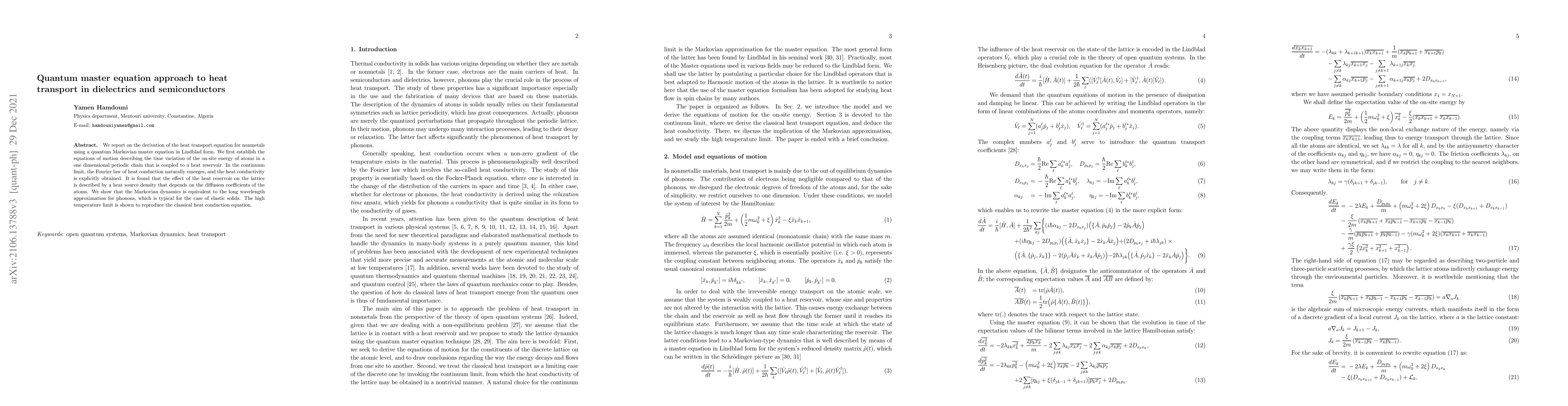 We report on the derivation of the heat transport equation for nonmetals using a quantum Markovian master equation in Lindblad form. We first establish the equations of motion describing the time variation of the on-site energy of atoms in a one dimensional periodic chain that is coupled to a heat reservoir. In the continuum limit, the Fourier law of heat conduction naturally emerges, and the heat conductivity is explicitly obtained. It is found that the effect of the heat reservoir on the lattice is described by a heat source density that depends on the diffusion coefficients of the atoms. We show that the Markovian dynamics is equivalent to the long wavelength approximation for phonons, which is typical for the case of elastic solids. The high temperature limit is shown to reproduce the classical heat conduction equation.