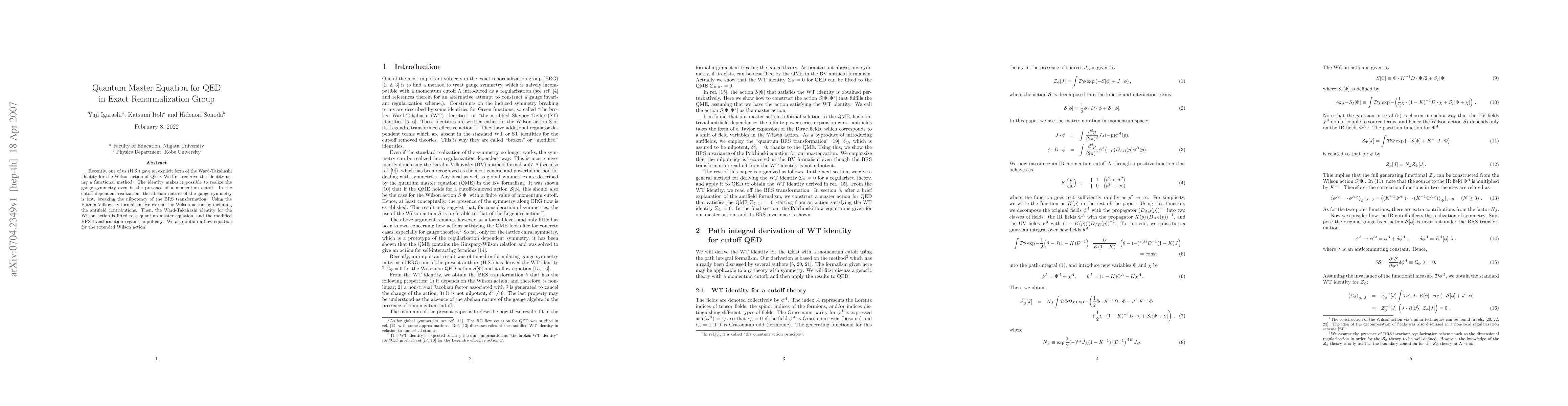 Researchers develop a quantum master equation for Quantum Electrodynamics (QED) using exact renormalization group, regaining nilpotency of the BRS transformation and providing a flow equation for the extended Wilson action.