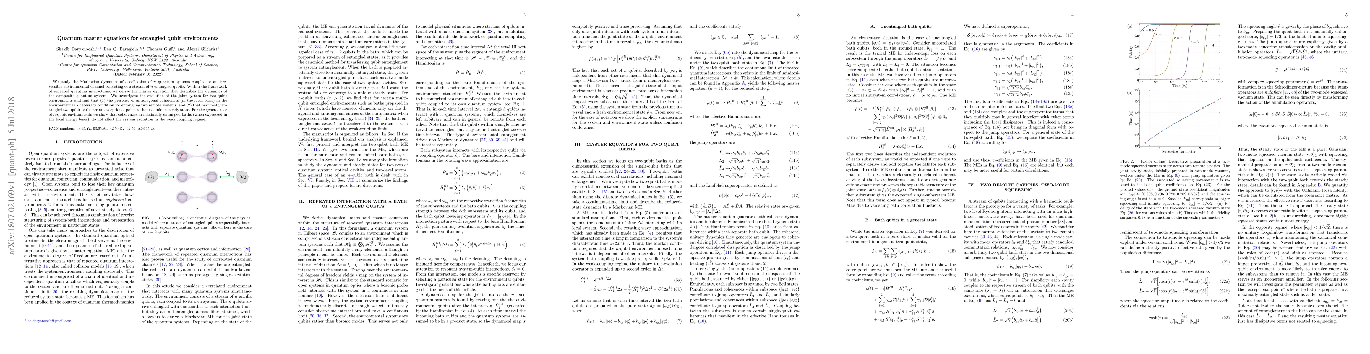 We study the Markovian dynamics of a collection of n quantum systems coupled to an irreversible environmental channel consisting of a stream of n entangled qubits. Within the framework of repeated quantum interactions, we derive the master equation that describes the dynamics of the composite quantum system. We investigate the evolution of the joint system for two-qubit environments and find that (1) the presence of antidiagonal coherences (in the local basis) in the environment is a necessary condition for entangling two remote systems, and (2) that maximally entangled two-qubit baths are an exceptional point without a unique steady state. For the general case of n-qubit environments we show that coherences in maximally entangled baths (when expressed in the local energy basis), do not affect the system evolution in the weak coupling regime